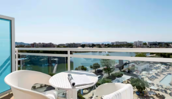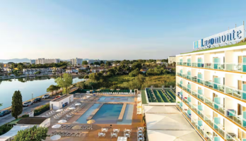 This hotel’s pulled up next to a lake in Port d’Alcudia. There’s an island in the middle of the lagoon, where you’ll find one of the hotel’s pools.