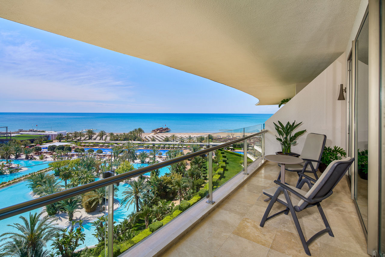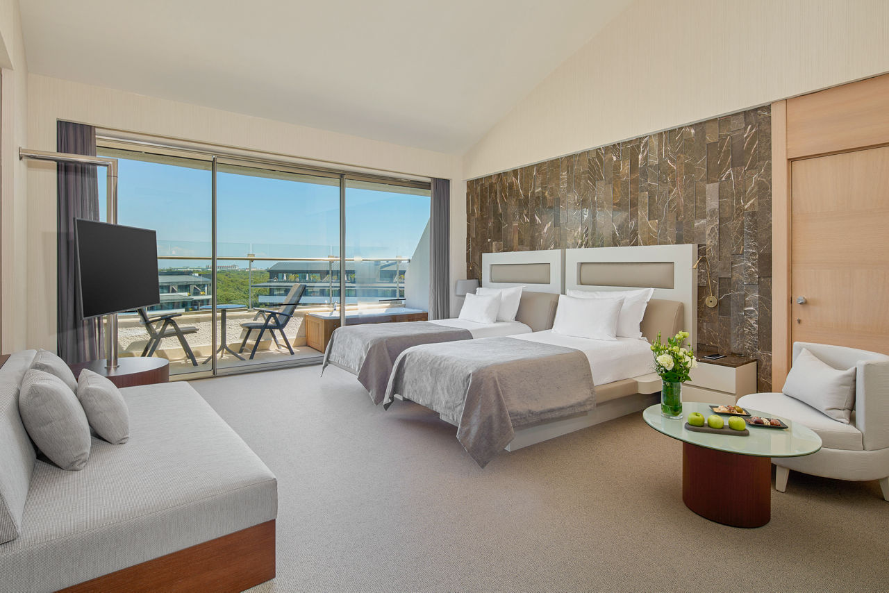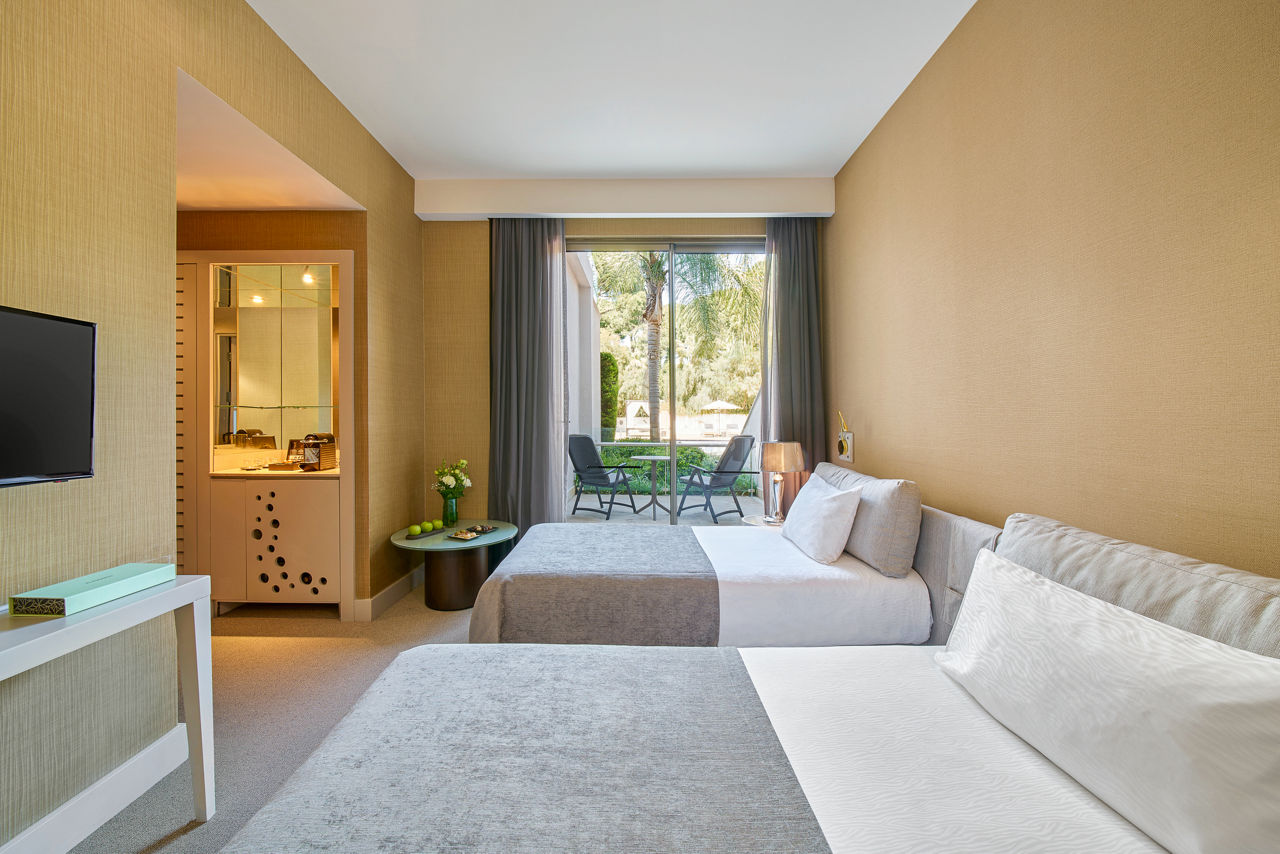 Suites with Land View sleep up to 3 adults and 1 child and have a bathroom with whirlpool bath and shower, air conditioning, hairdryer, bathrobes and slippers, flat screen television, free Wi-Fi and balcony or terrace. Suites with Sea View, Family suites, Terrace Family suites located in the family block sleeping up to 4 adults and 1 child and Terrace Lagoon Family suites are also available.