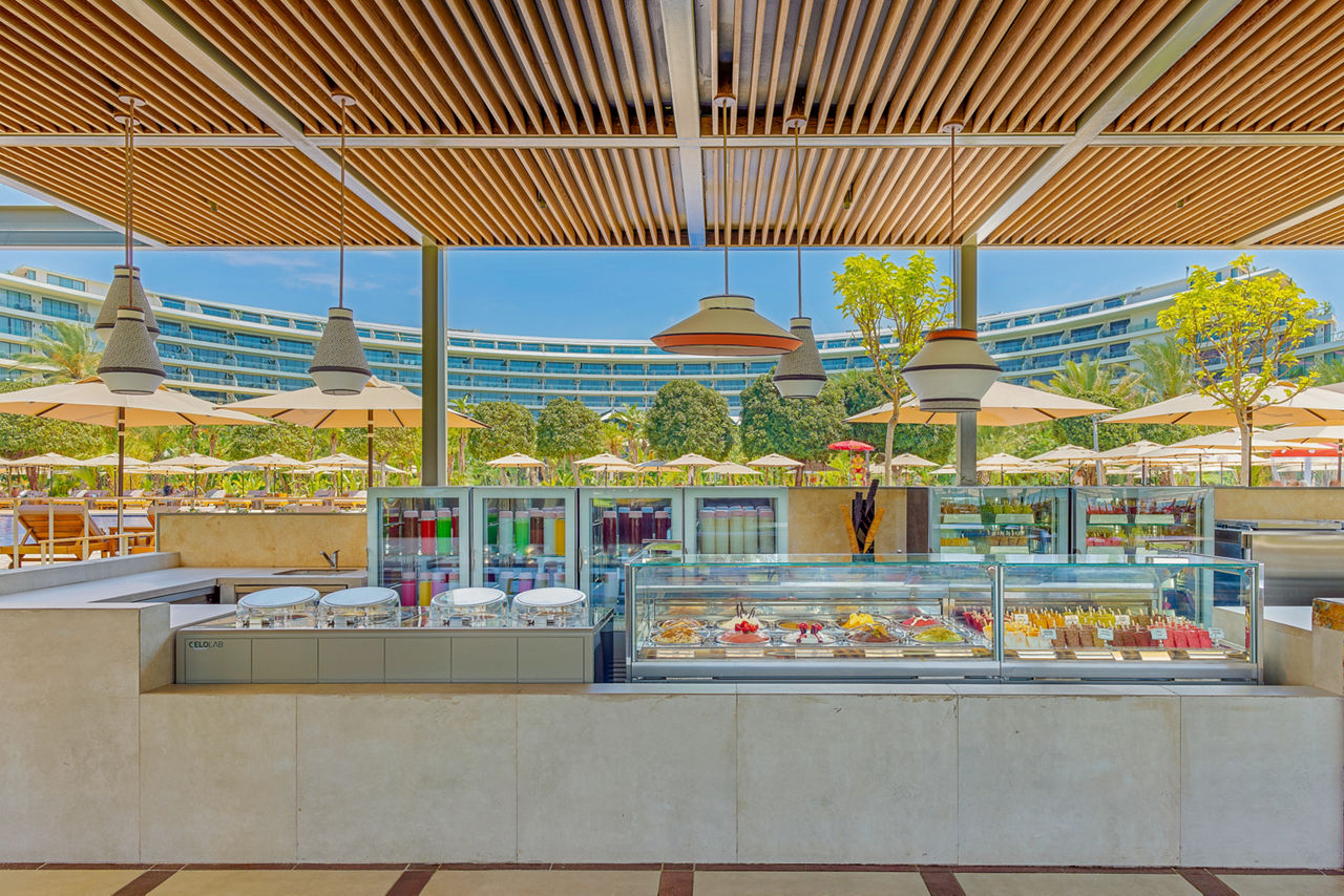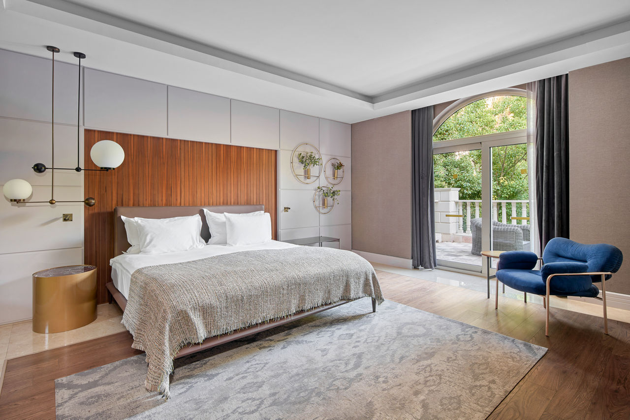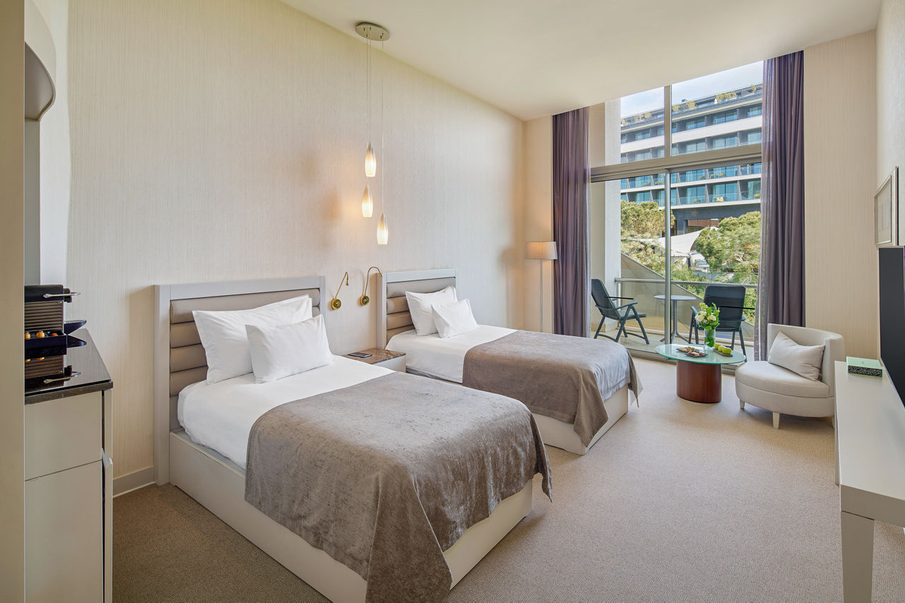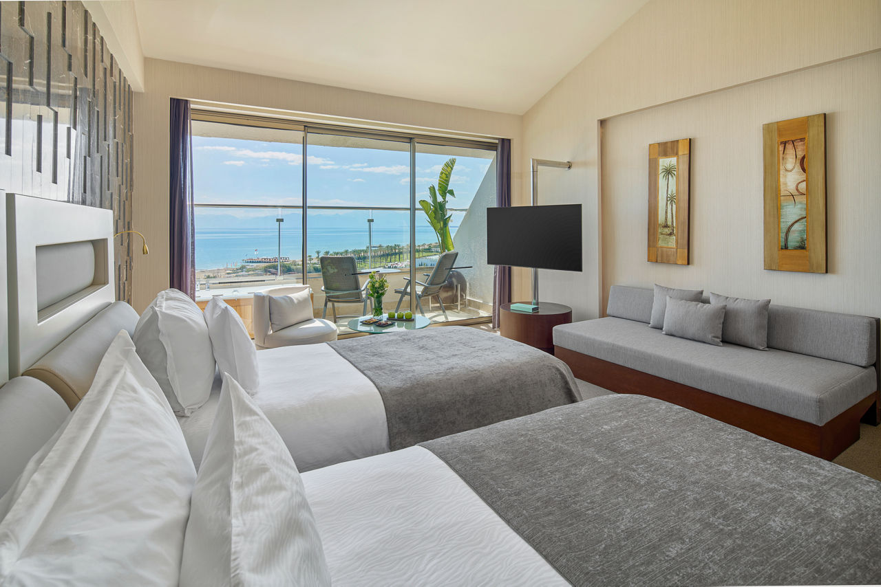 Suites with Land View sleep up to 3 adults and 1 child and have a bathroom with whirlpool bath and shower, air conditioning, hairdryer, bathrobes and slippers, flat screen television, free Wi-Fi and balcony or terrace. Suites with Sea View, Family suites, Terrace Family suites located in the family block sleeping up to 4 adults and 1 child and Terrace Lagoon Family suites are also available.