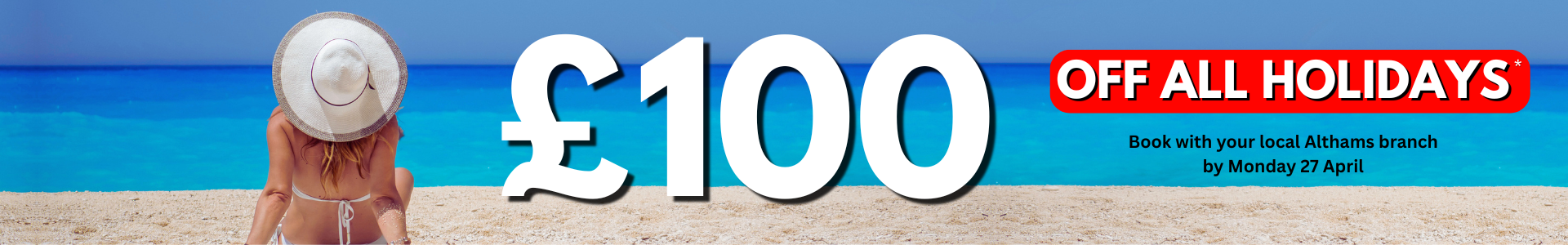 *Save £100 is per booking and applies to selected new package holidays & selected new cruise holidays booked with Althams Travel between 24/04/26 - 28/04/26. Minimum spend of £2000 per booking applies. Not valid on a price-match or on holidays confirmed on althams.co.uk. Offers are subject to availability and can be changed or withdrawn without notice. Terms & conditions apply.