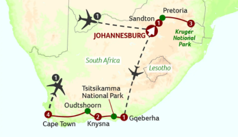 10 excursions & visits: Pretoria orientation tour, Visits to Voortrekker Monument; and Pilgrim’s Rest and God’s Window, Tsitsikamma National Park, Storms River & the Garden Route, Visit to Featherbed Nature Reserve, Tour of ostrich farm, Spectacular Route 62, City tour of Cape Town including Table Mountain cable car ride (weather permitting), Tour to the Cape of Good Hope and Cape Point (including Boulders Beach)