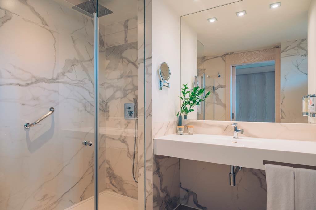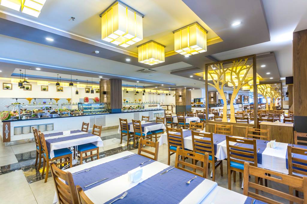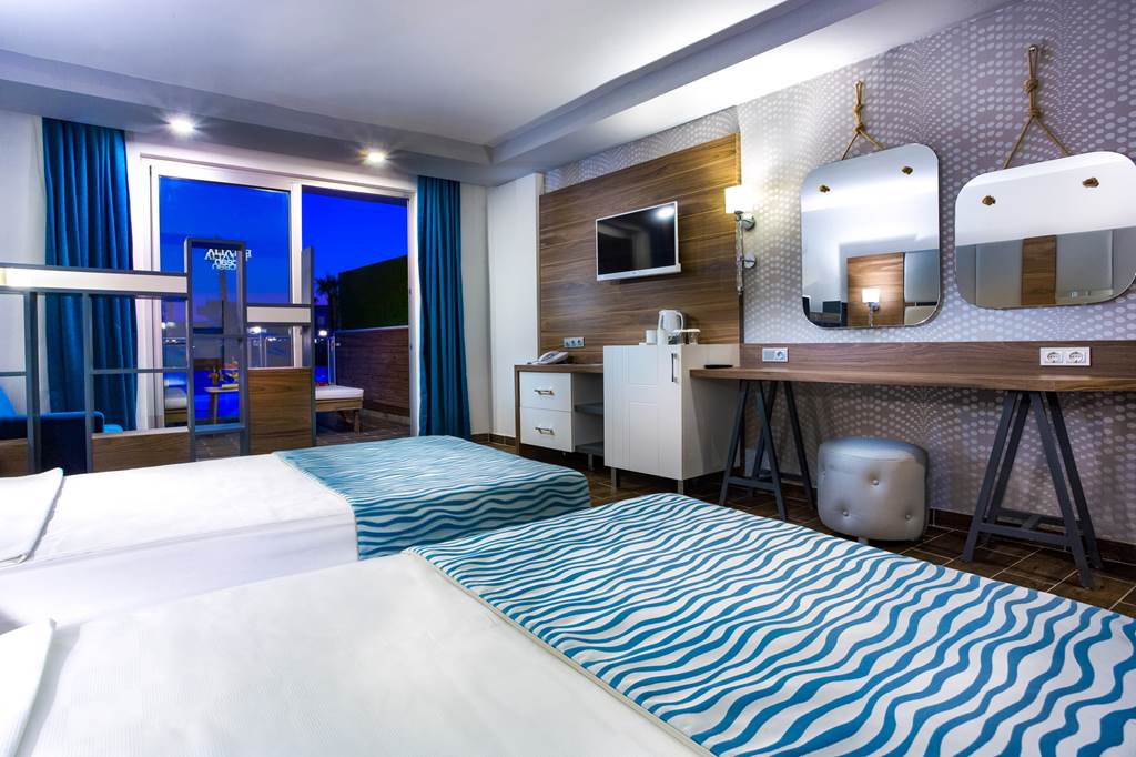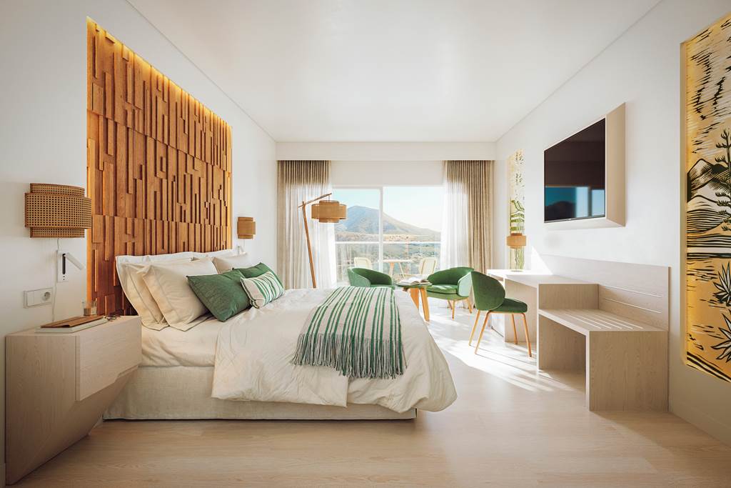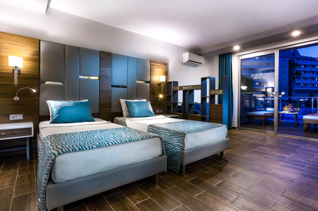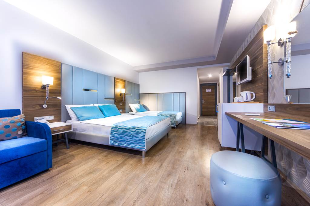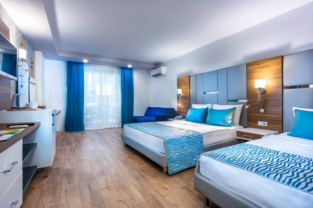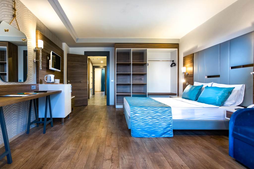 Double rooms sleep up to 2 adults and 1 child and have satellite TV, air-conditioning, full bathroom, hairdryer, fridge and balcony or terrace. Side sea view, Sea view, Superior, Family rooms and Suites are also available.