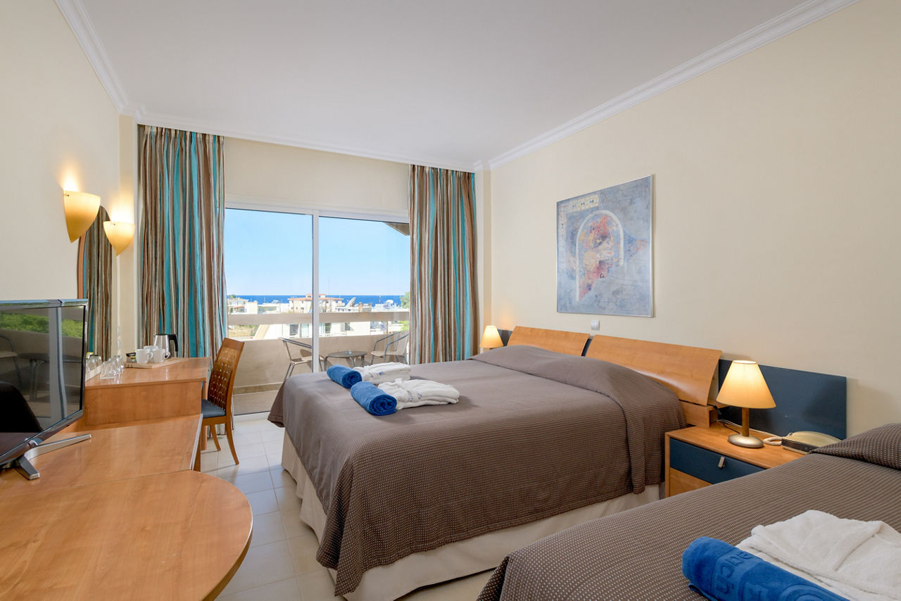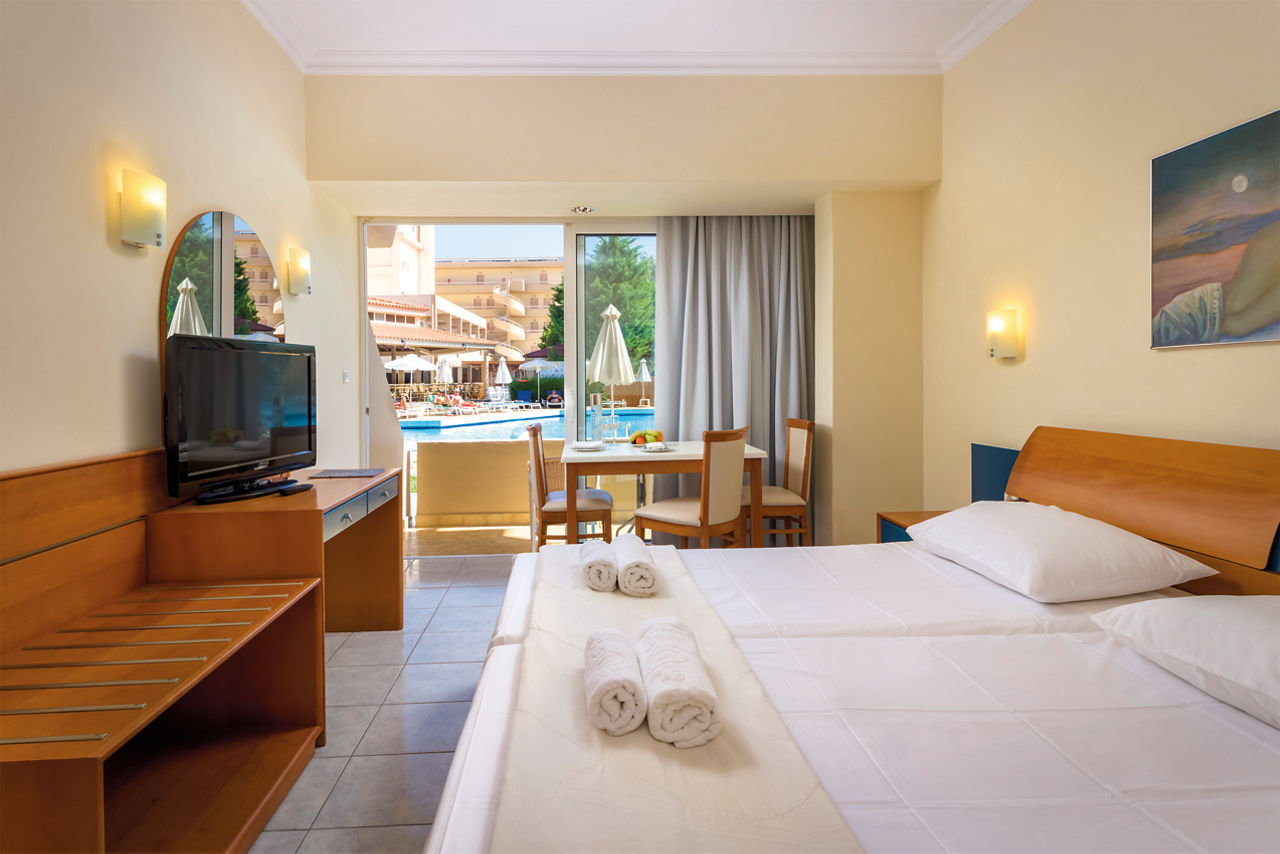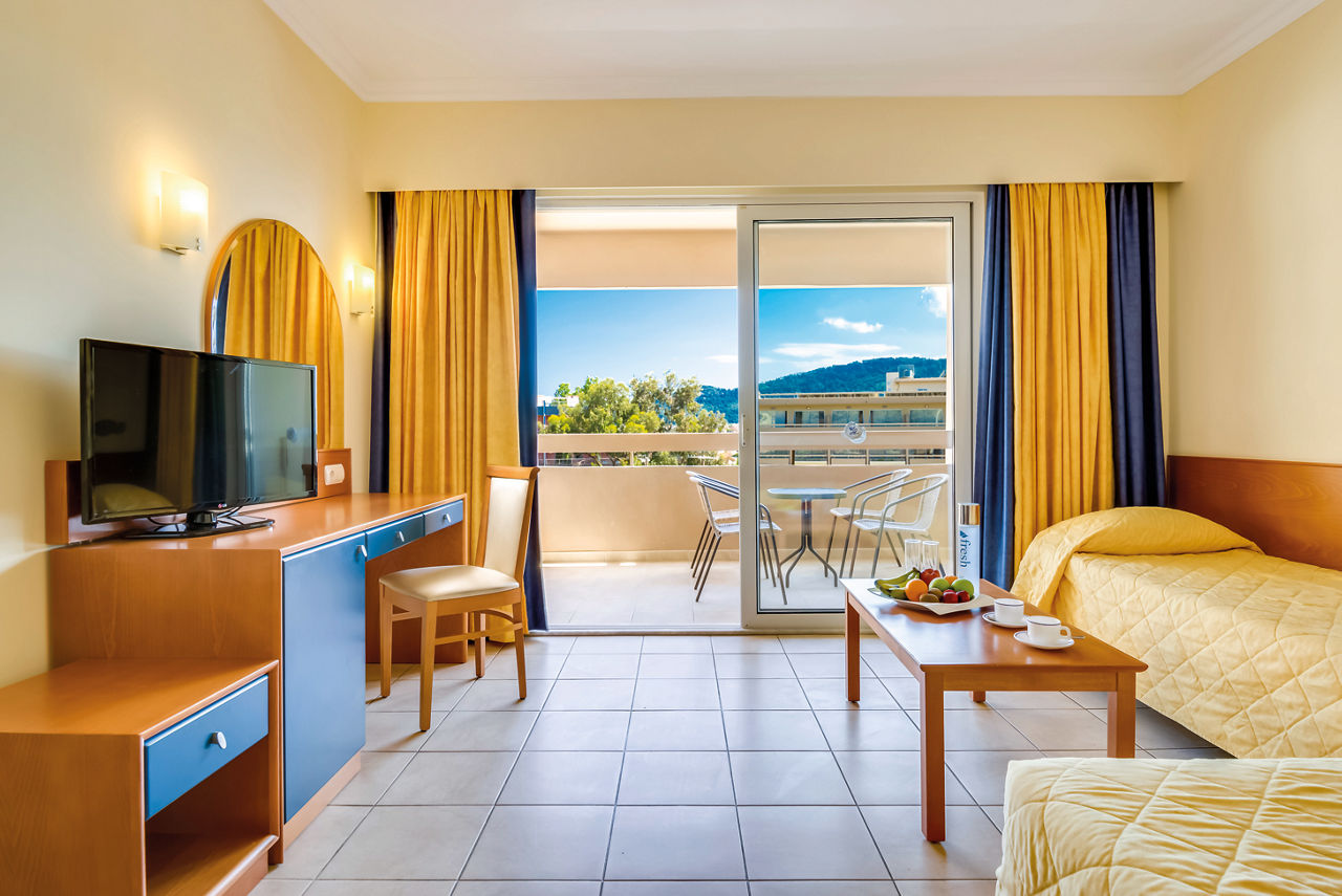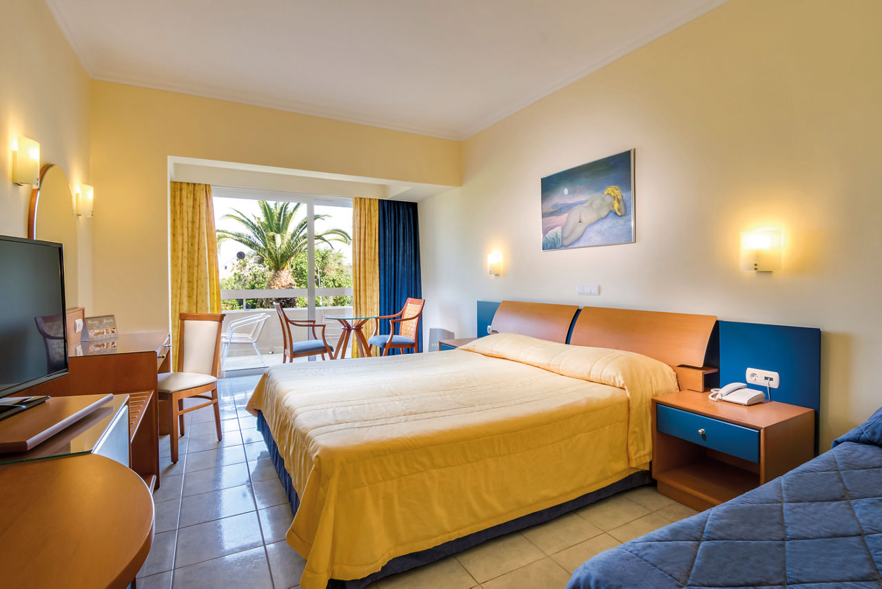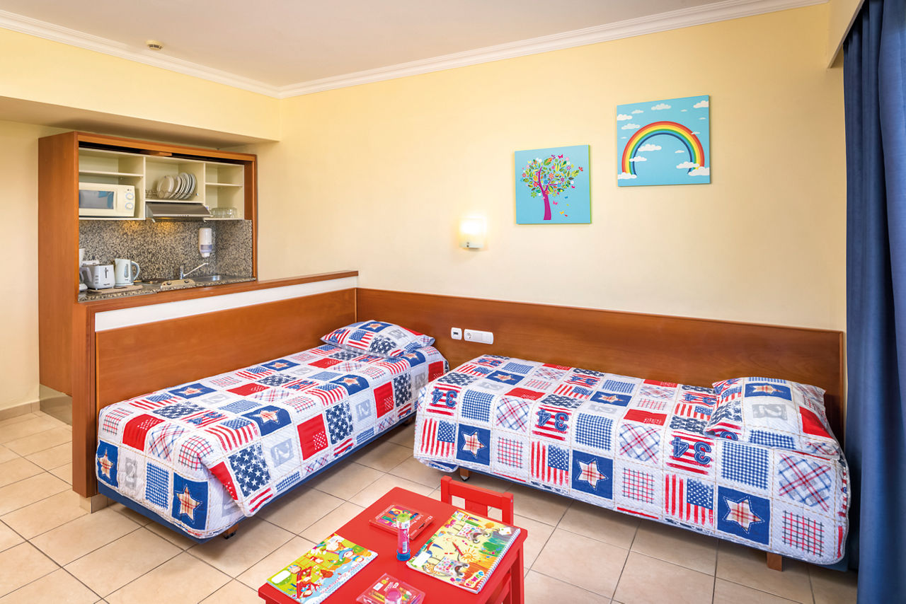 Standard twin rooms sleep up to 3 adults and have a bathroom containing a bath with shower attachment, air conditioning (01 Jun-30 Sep), hairdryer, television, fridge and balcony or terrace. Standard Family rooms, Superior Twin rooms, Deluxe suite apartment with Garden View, Deluxe suite apartments with Sea View and Double room for Sole Use are also available. Deluxe suite apartments also have coffee making facilities, bathrobe and slippers, dvd player, double cooking rings, microwave, fridge freezer and toaster.