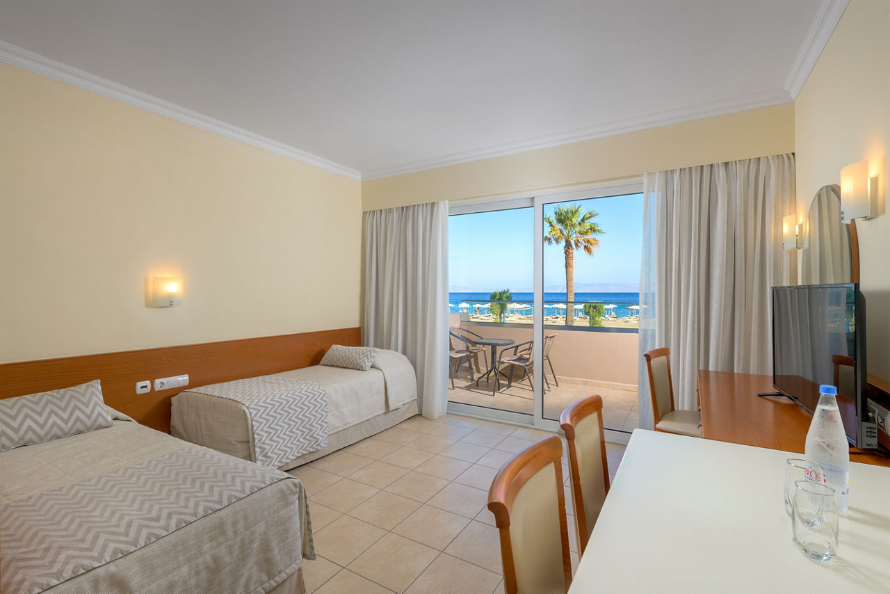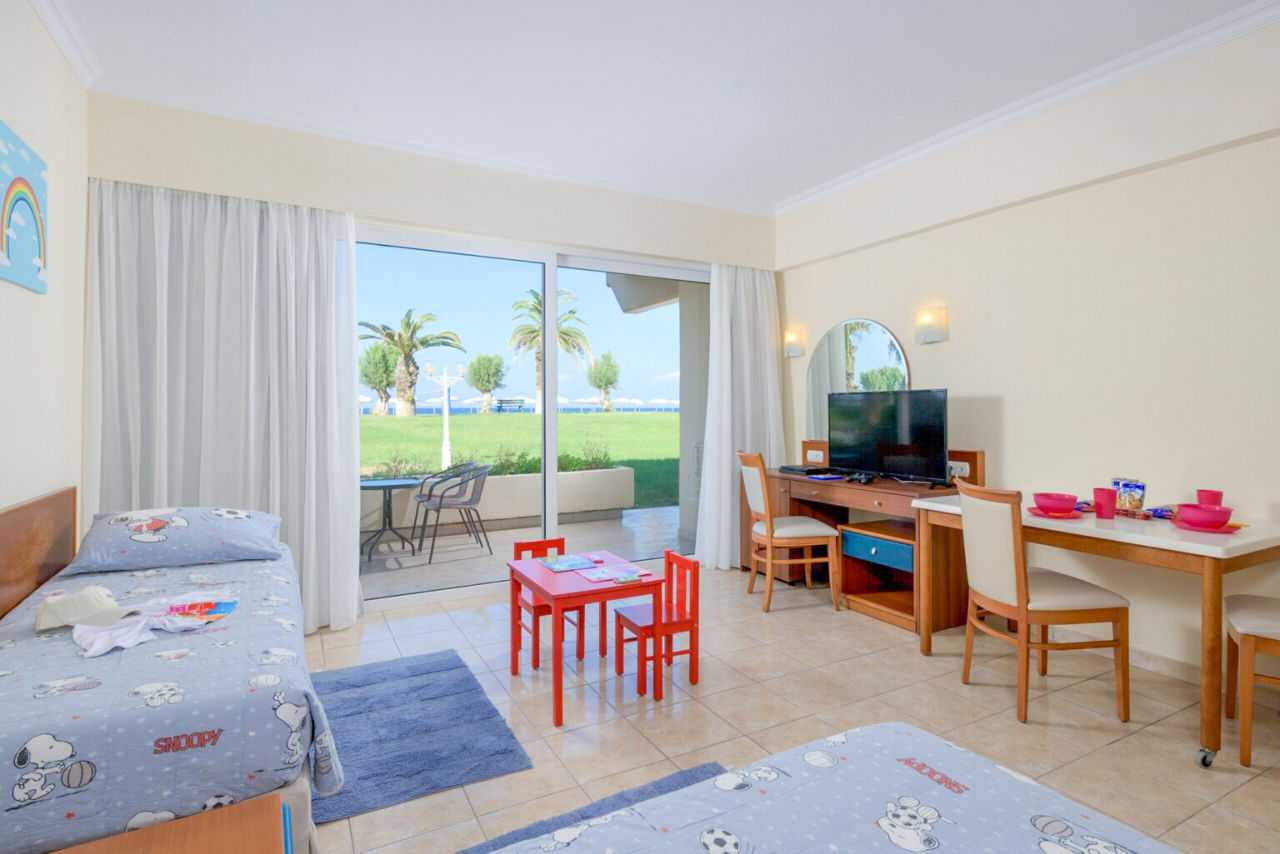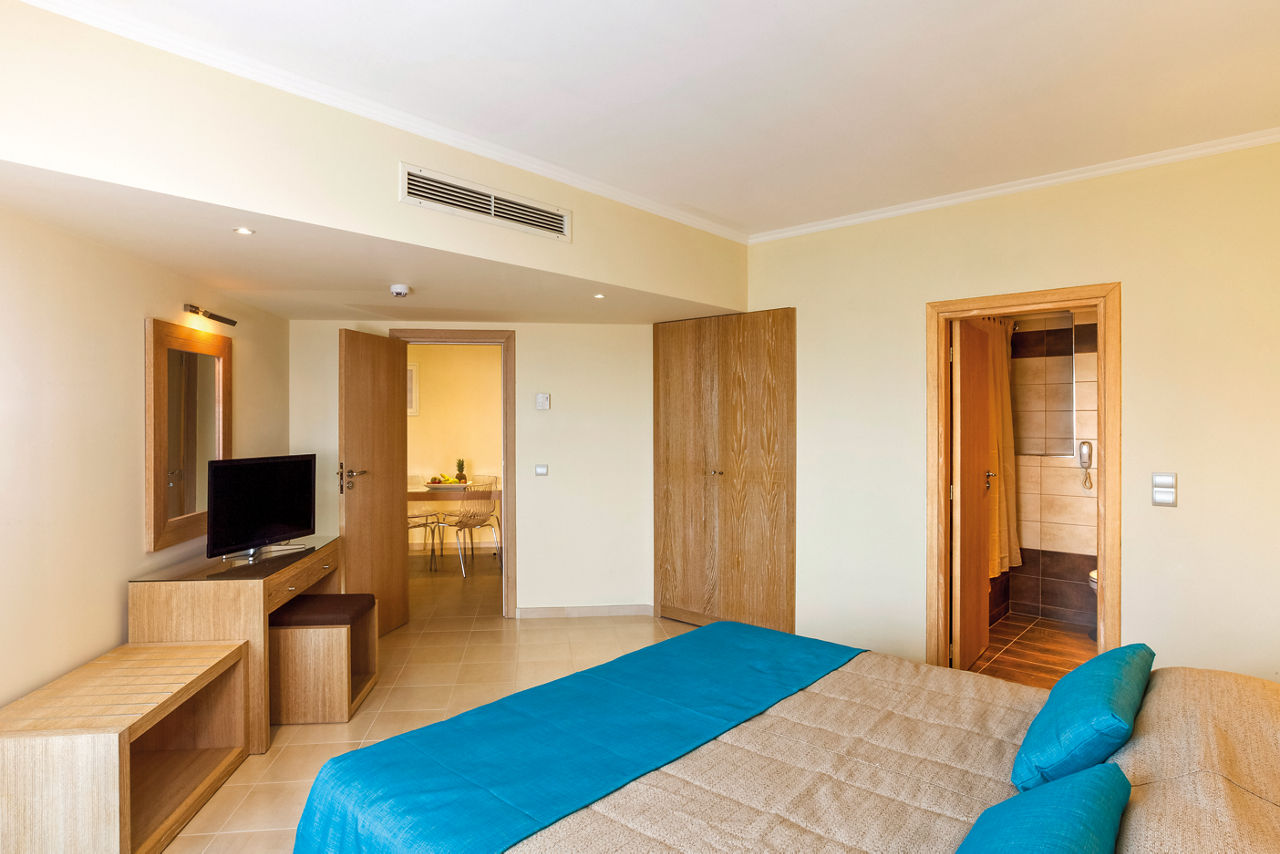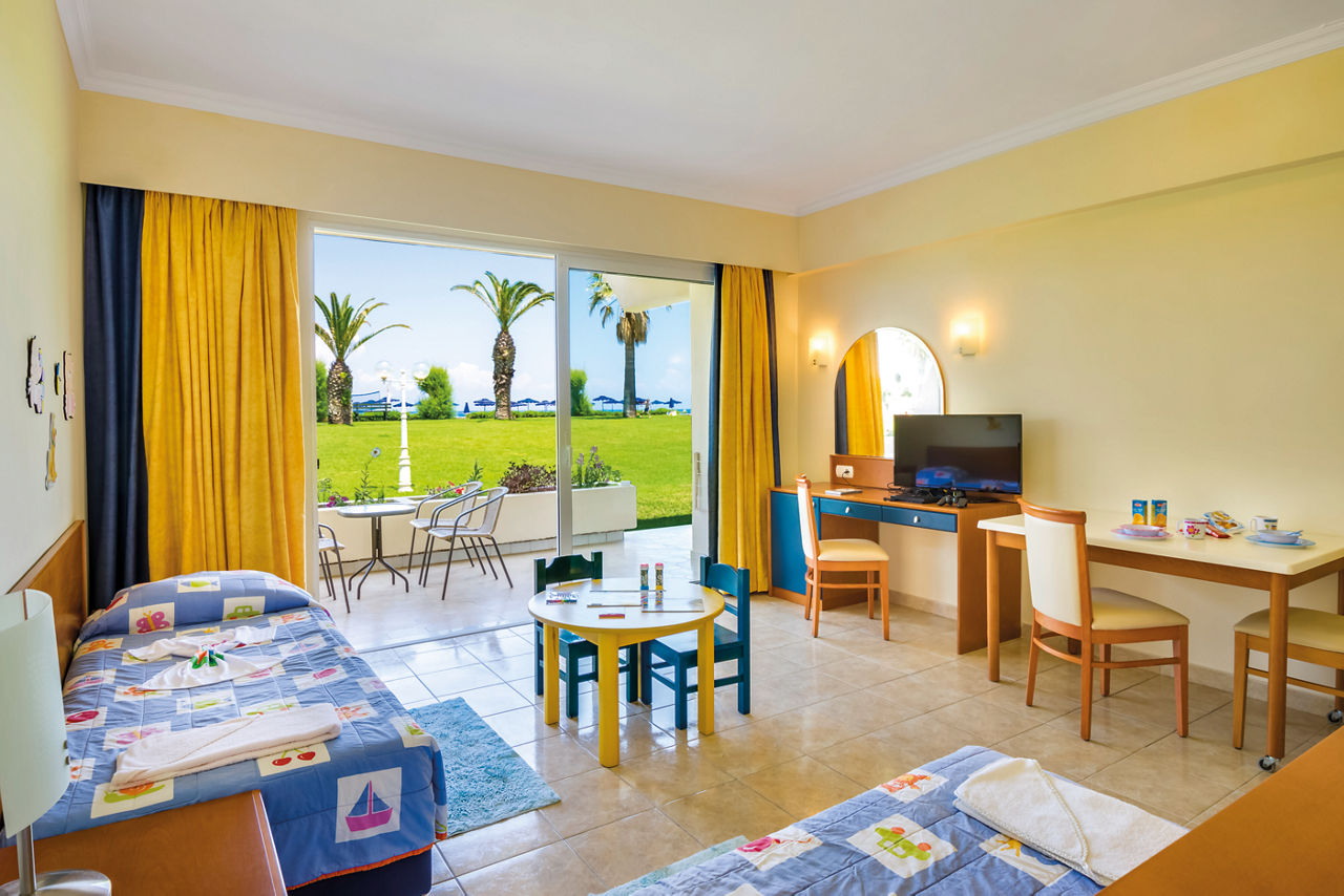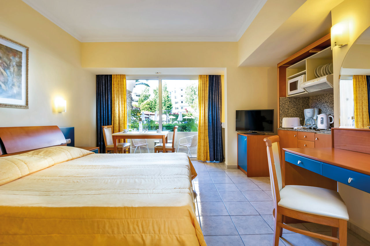 Standard twin rooms sleep up to 3 adults and have a bathroom containing a bath with shower attachment, air conditioning (01 Jun-30 Sep), hairdryer, television, fridge and balcony or terrace. Standard Family rooms, Superior Twin rooms, Deluxe suite apartment with Garden View, Deluxe suite apartments with Sea View and Double room for Sole Use are also available. Deluxe suite apartments also have coffee making facilities, bathrobe and slippers, dvd player, double cooking rings, microwave, fridge freezer and toaster.