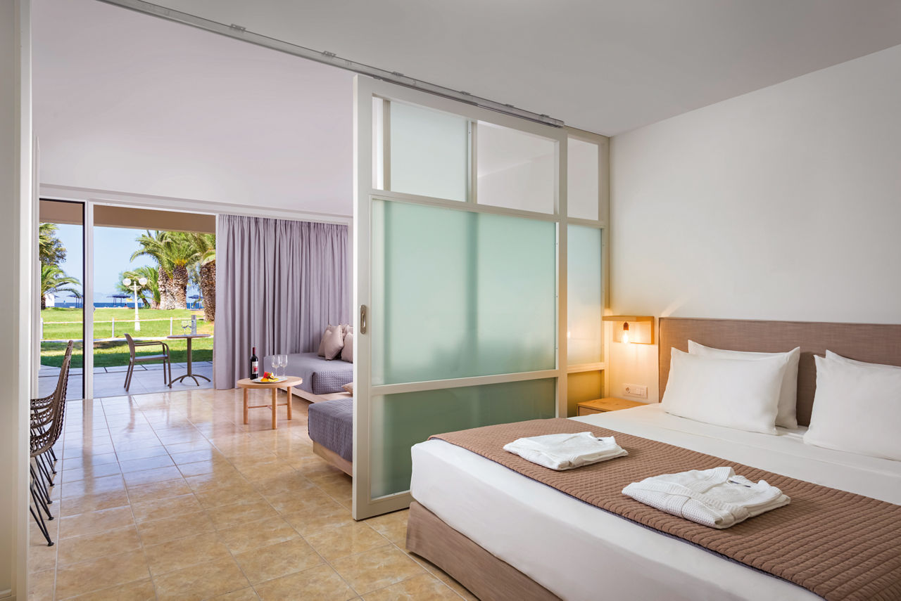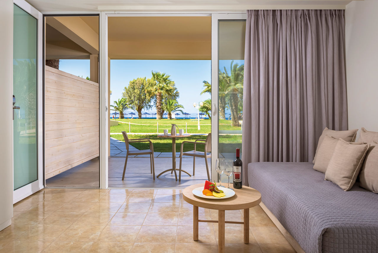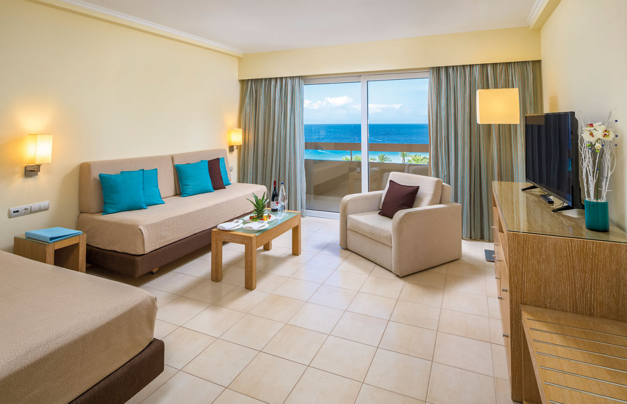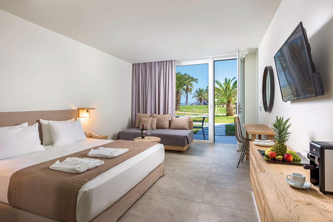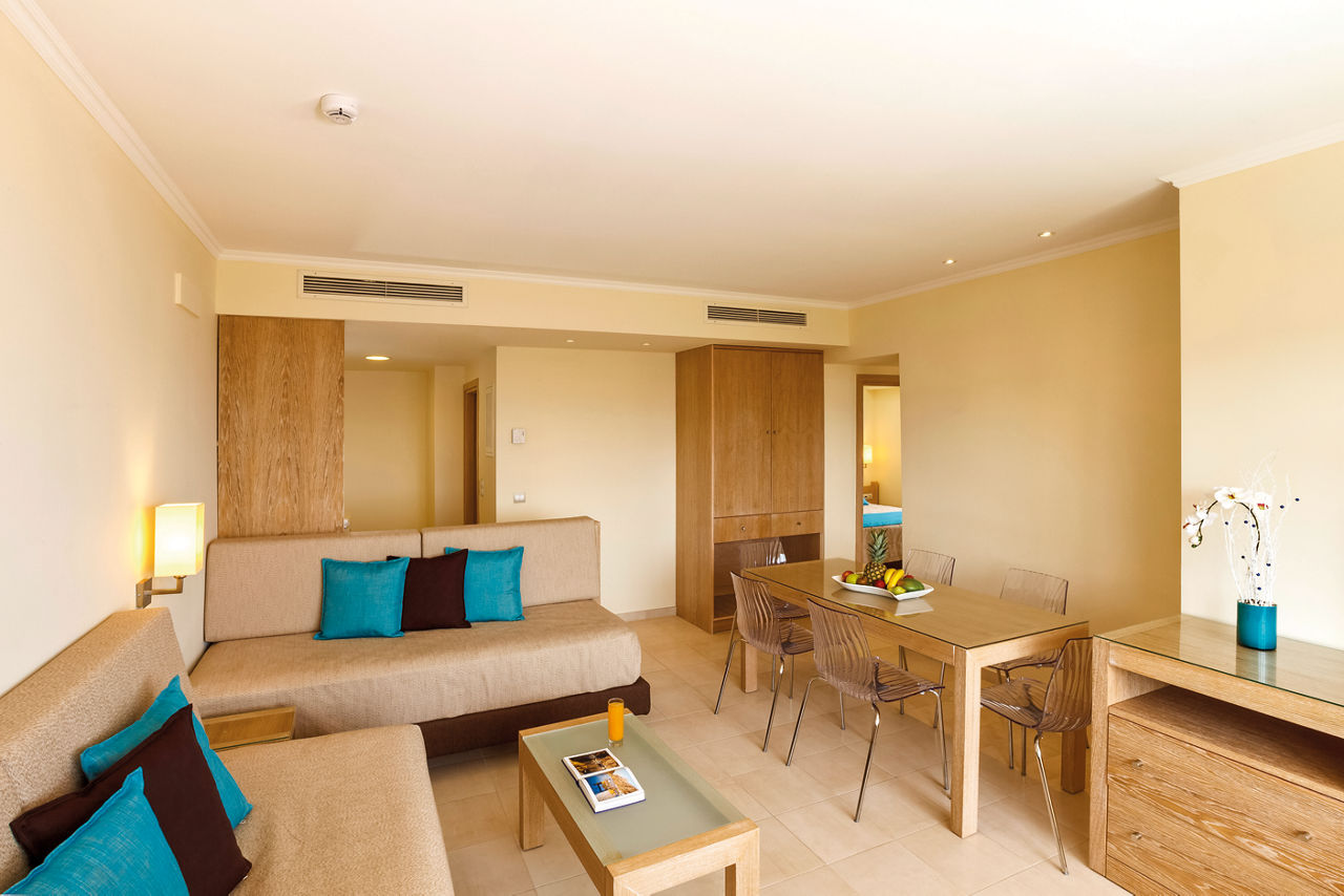 Standard twin rooms sleep up to 3 adults and have a bathroom containing a bath with shower attachment, air conditioning (01 Jun-30 Sep), hairdryer, television, fridge and balcony or terrace. Standard Family rooms, Superior Twin rooms, Deluxe suite apartment with Garden View, Deluxe suite apartments with Sea View and Double room for Sole Use are also available. Deluxe suite apartments also have coffee making facilities, bathrobe and slippers, dvd player, double cooking rings, microwave, fridge freezer and toaster.