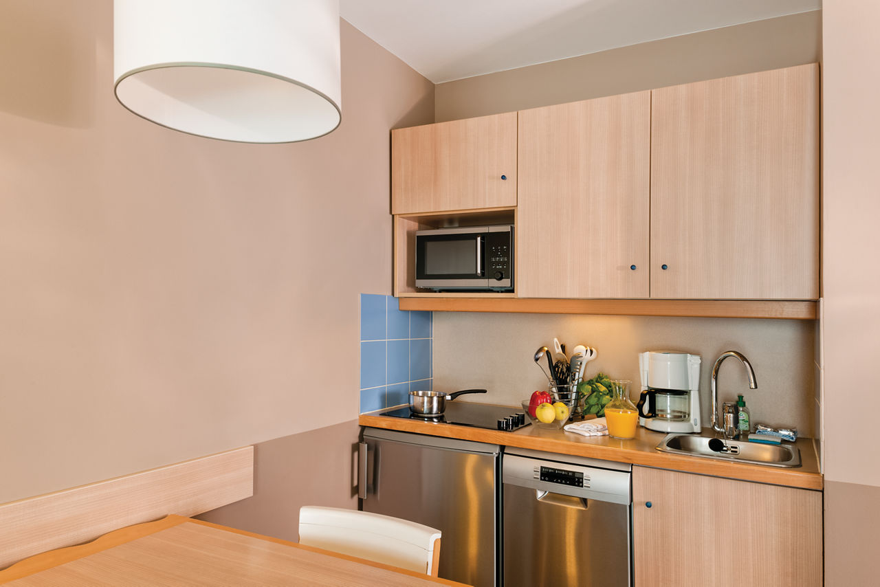 One Bedroom apartments sleep up to 4 adults and have bathroom containing a bath or shower, hairdryer, flat screen television, tea and coffee making facilities, kitchenette including a microwave, fridge, dishwasher, 4 cooking rings and safety deposit box. Room upgrades are also available. Please note that apartments have a double bed, sofa bed and pull out bed.