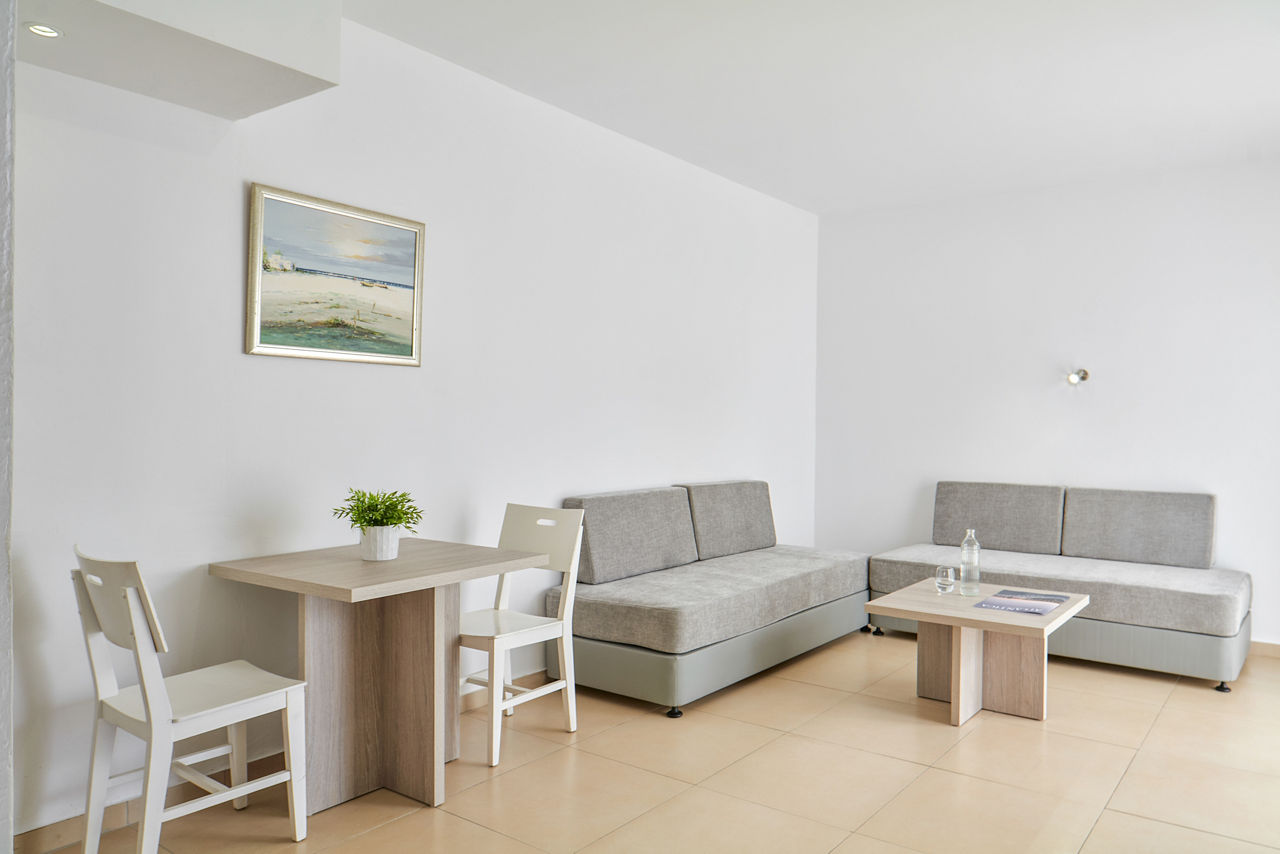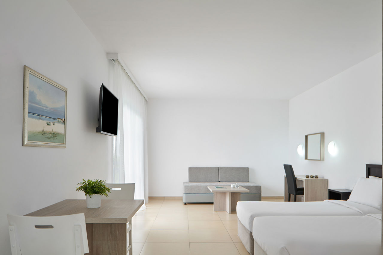 Studios sleep up to 2 adults and 1 child and have bathroom containing a bath with shower attachment, air conditioning, hairdryer, television, fridge, double cooking rings, oven, microwave, toaster, tea and coffee making facilities and balcony or terrace. One Bedroom apartments sleeping up to 4 are also available.