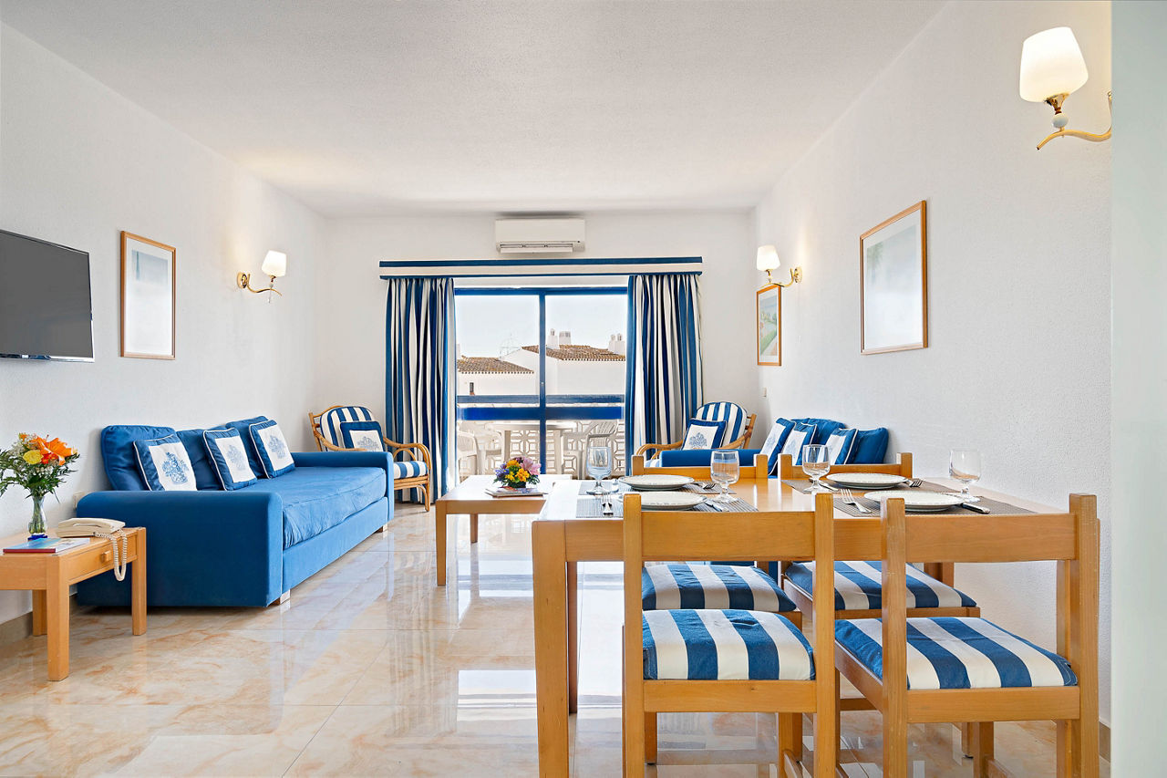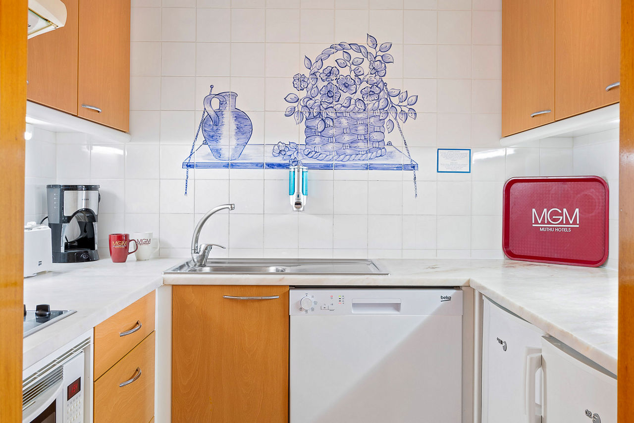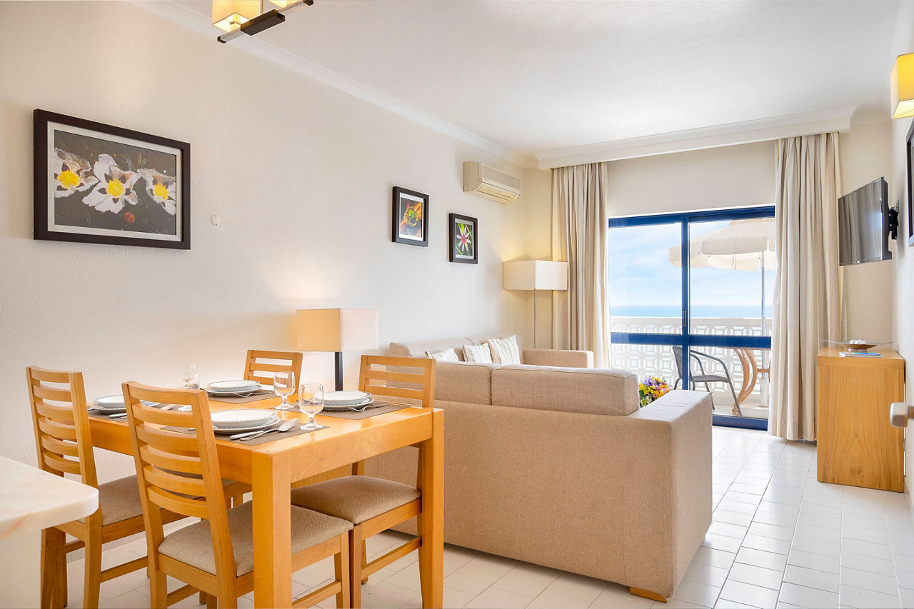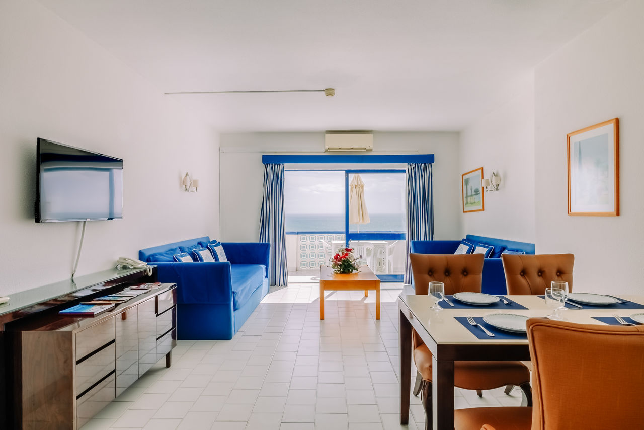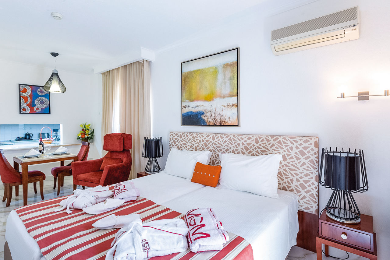 Deluxe rooms sleep 2 adults and have bathroom containing a bath with shower attachment, air conditioning, hairdryer, flat screen television, double cooking rings, fridge-freezer, microwave, oven, tea and coffee making facilities and balcony or terrace. Superior Terrace One Bedroom apartments and Deluxe One and Two Bedroom apartments are also available.