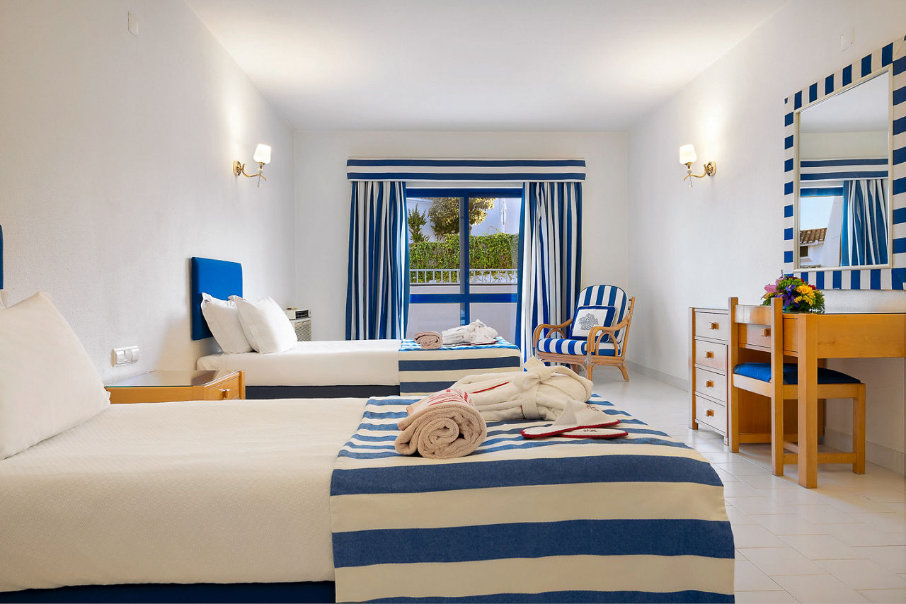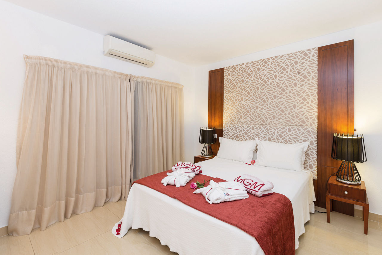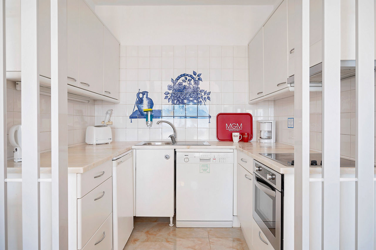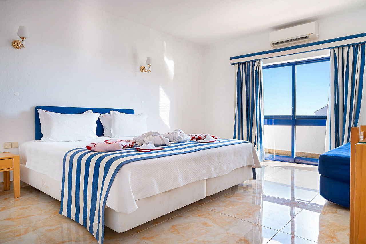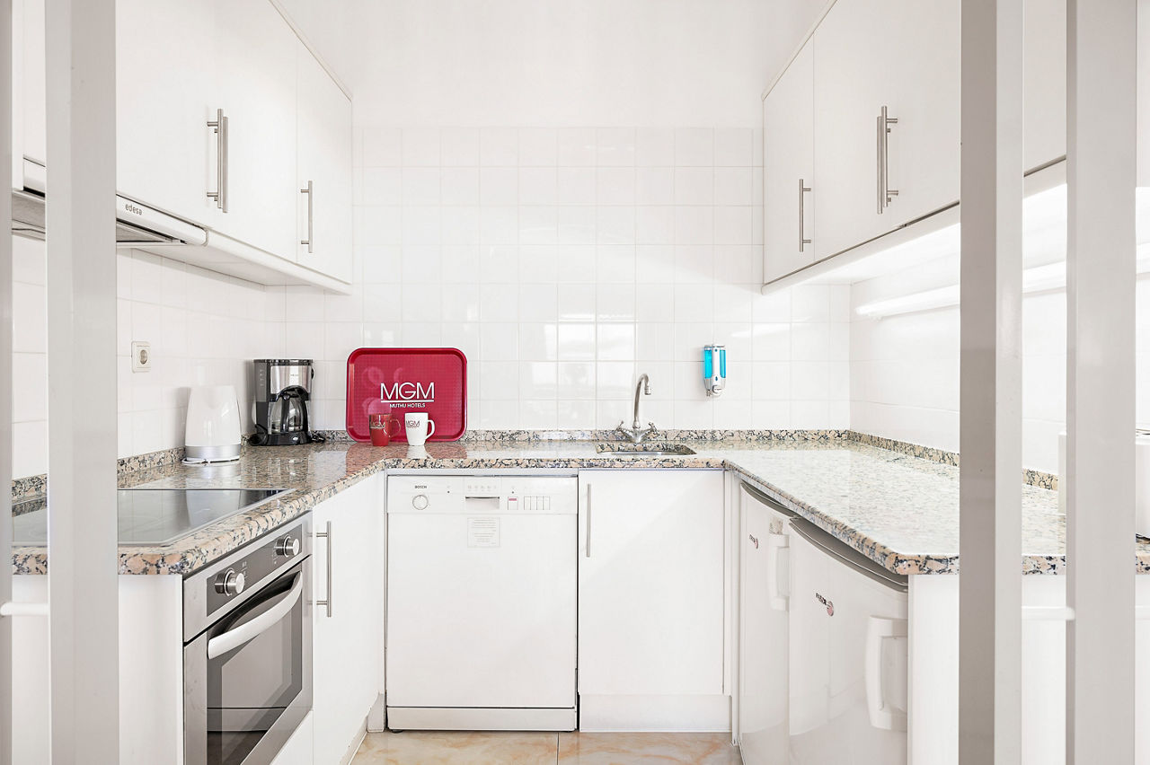 Deluxe rooms sleep 2 adults and have bathroom containing a bath with shower attachment, air conditioning, hairdryer, flat screen television, double cooking rings, fridge-freezer, microwave, oven, tea and coffee making facilities and balcony or terrace. Superior Terrace One Bedroom apartments and Deluxe One and Two Bedroom apartments are also available.