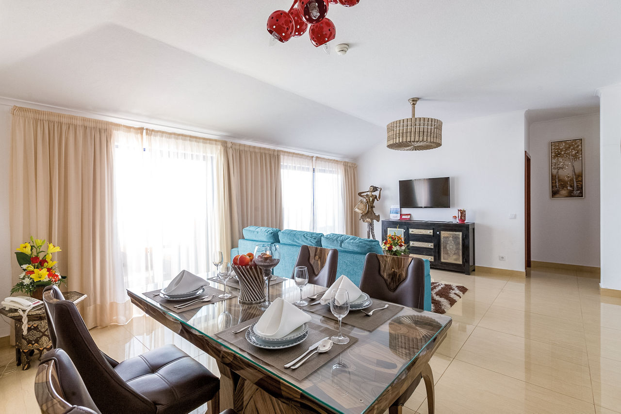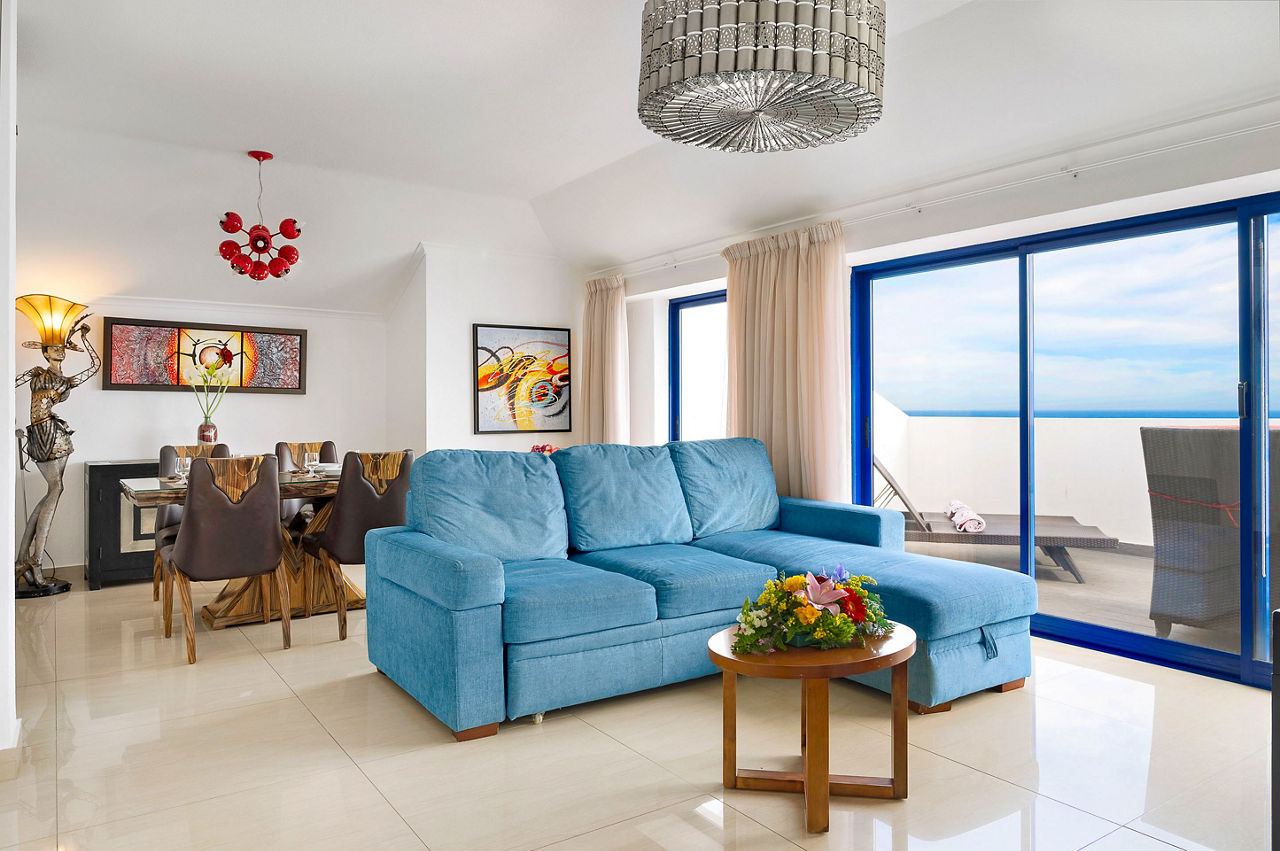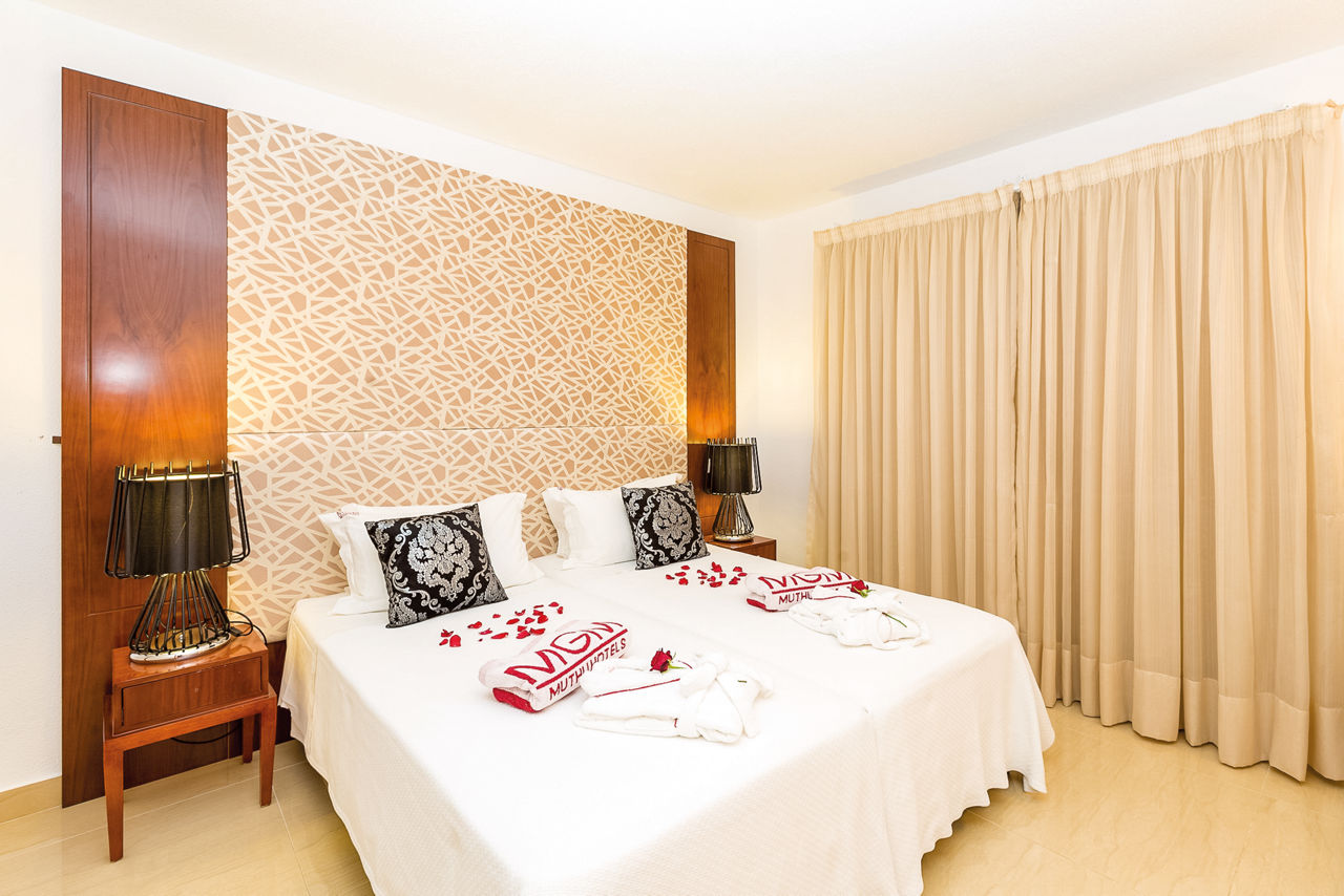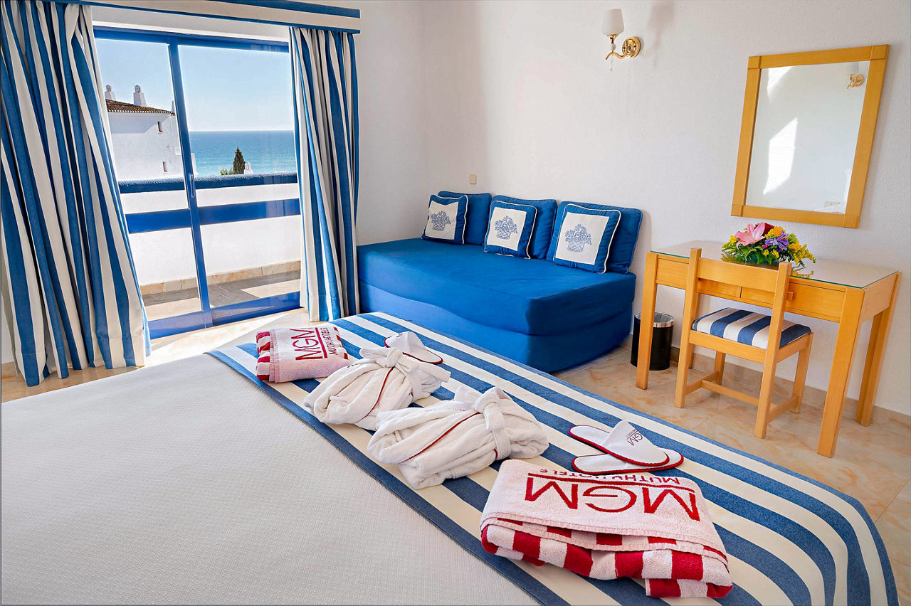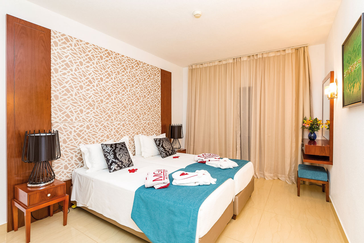 Deluxe rooms sleep 2 adults and have bathroom containing a bath with shower attachment, air conditioning, hairdryer, flat screen television, double cooking rings, fridge-freezer, microwave, oven, tea and coffee making facilities and balcony or terrace. Superior Terrace One Bedroom apartments and Deluxe One and Two Bedroom apartments are also available.