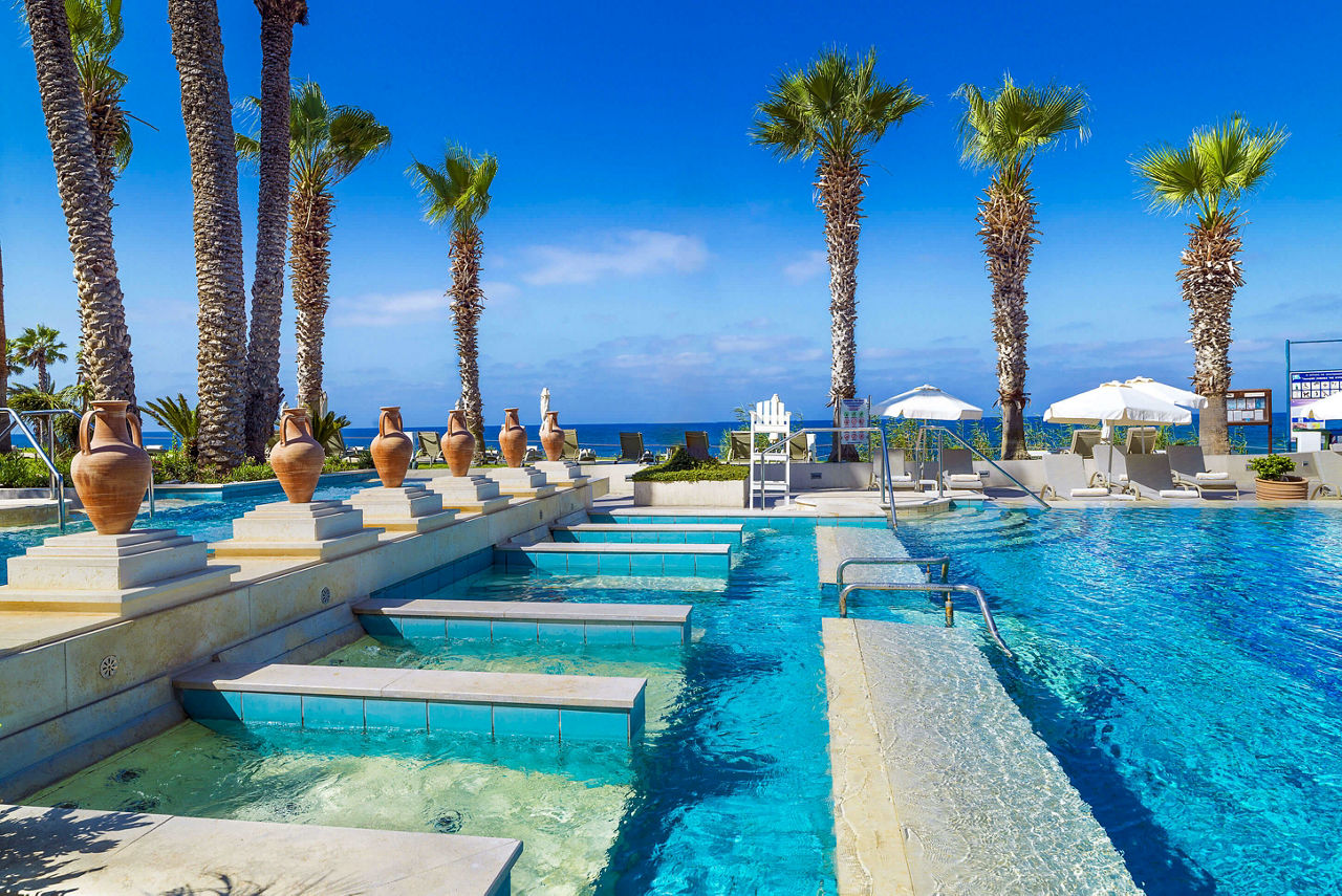 Renowned for its impeccable service and outstanding cuisine, this long-established and award-winning hotel boasts a central beachfront location overlooking the picturesque harbour and Mediterranean Sea. Here you will find fantastic accommodation, a great variety of facilities, and an upgraded half board and full board concept that includes a choice of five restaurants and drinks with meals. Paphos harbour, with its shops, bars and restaurants, is close by and can be reached by a picturesque meandering seafront path. This hotel is a perfect choice for a luxury holiday for both couples and families.