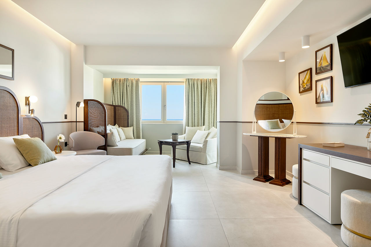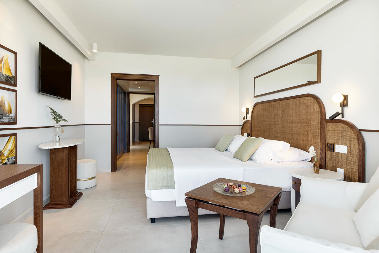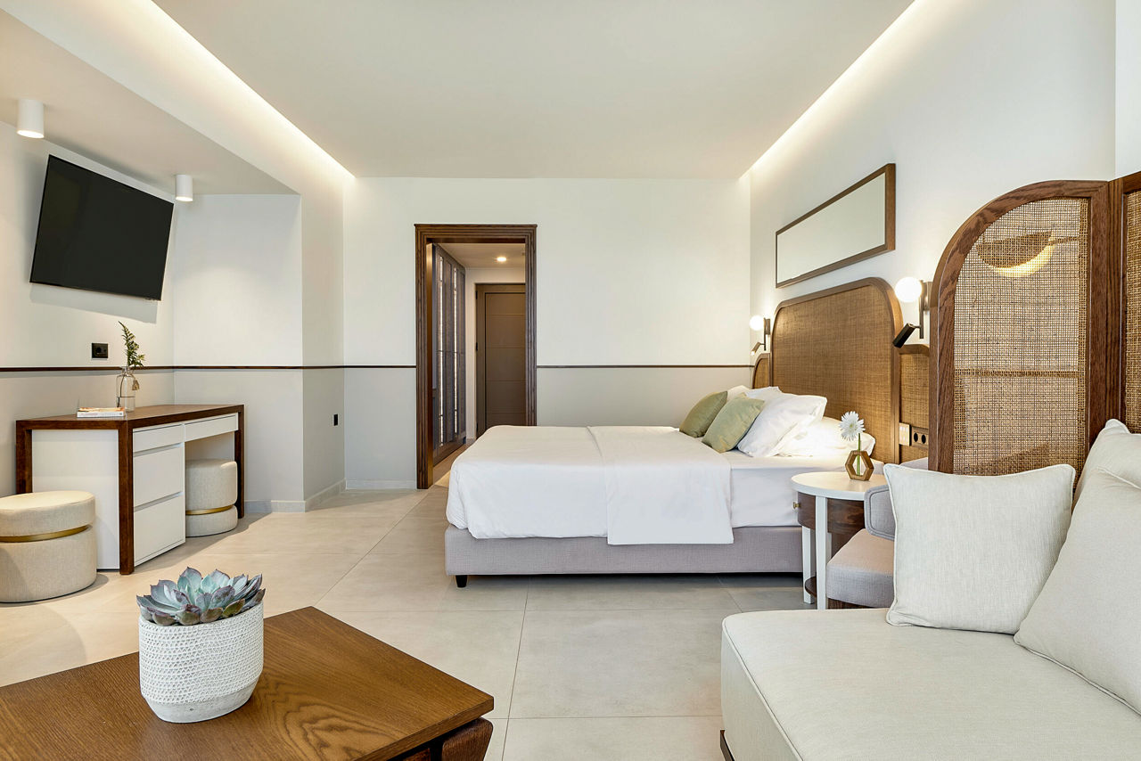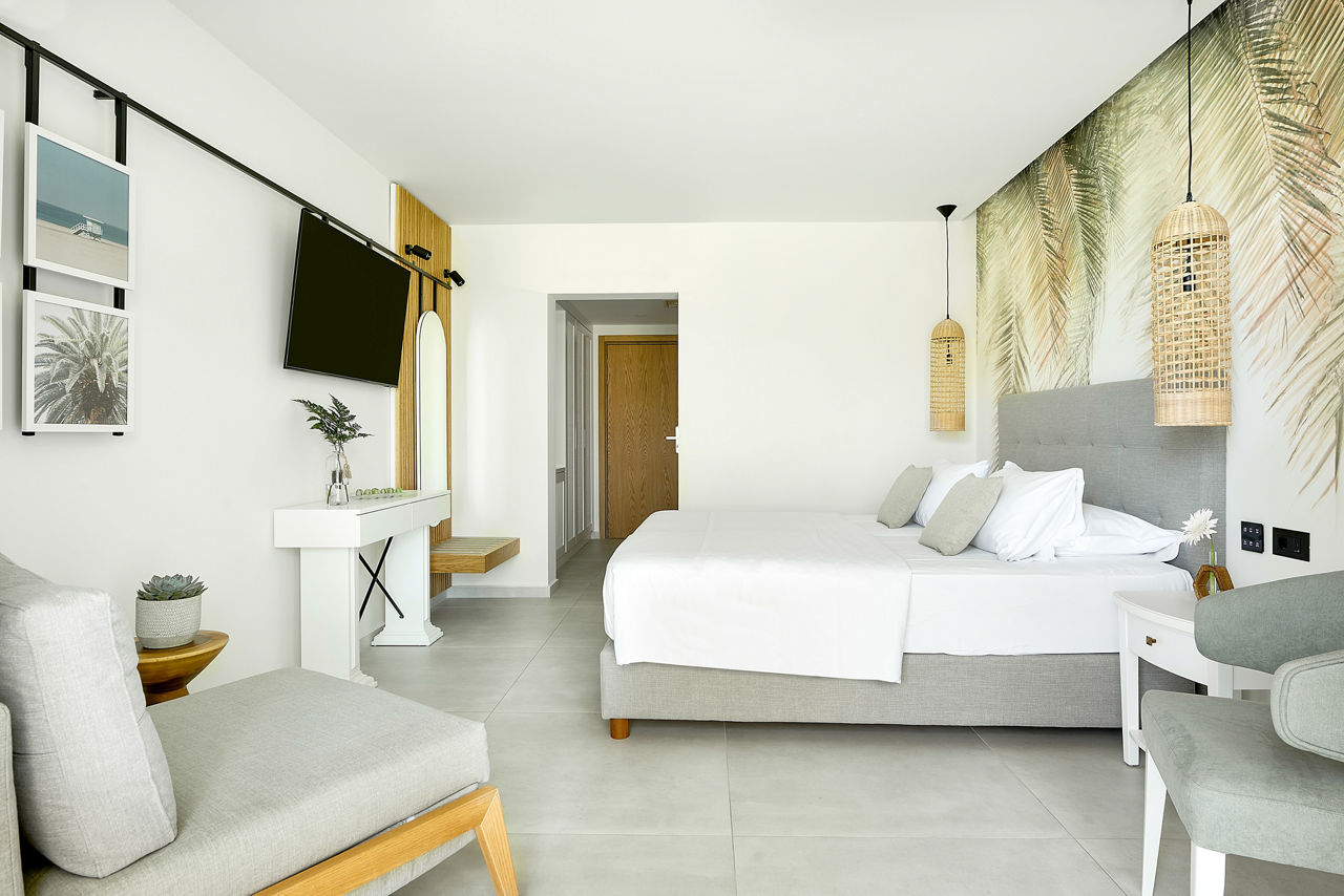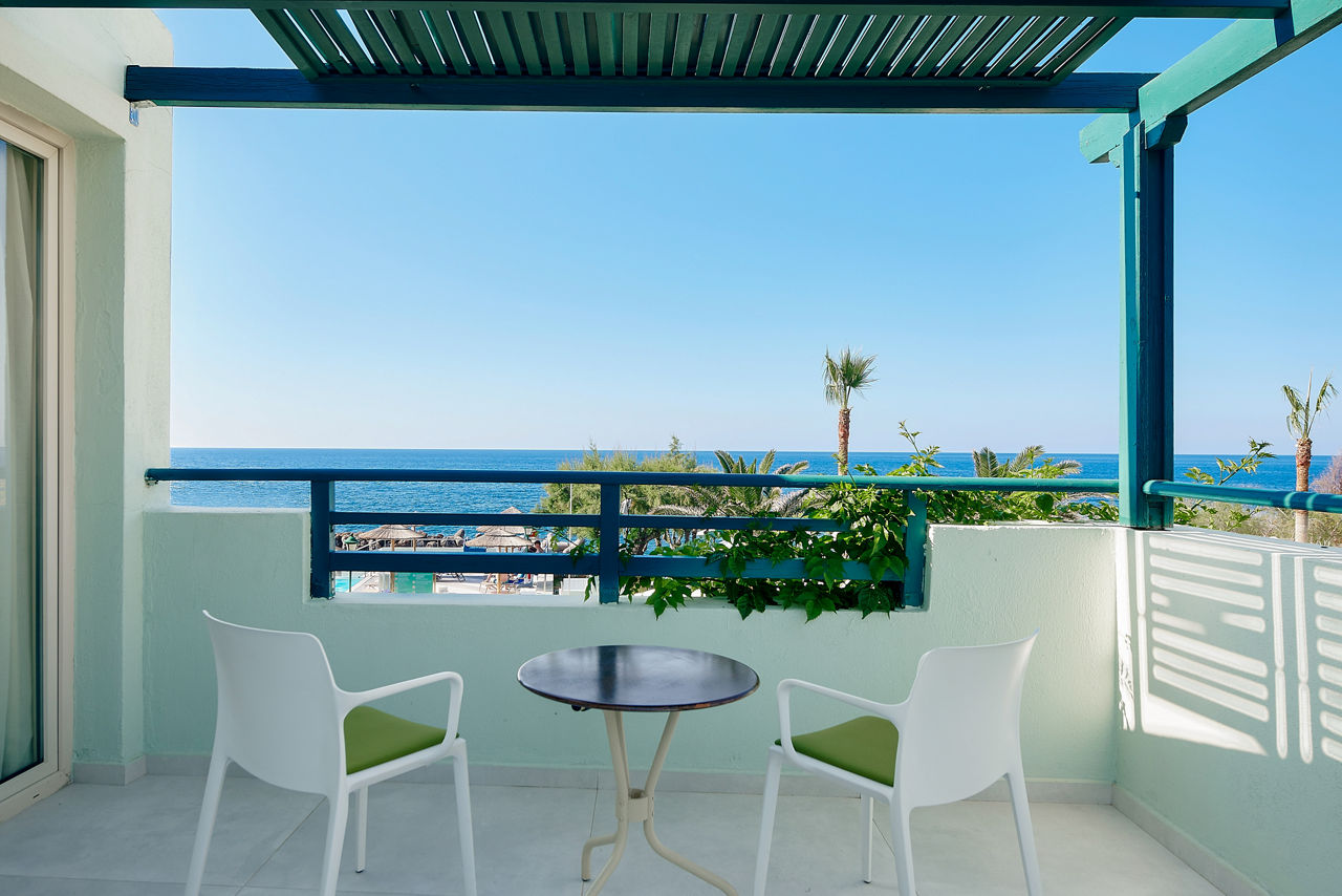Double and Twin rooms sleep up to 3 adults or 2 adults and 1 child and have a bathroom with shower, air conditioning, hairdryer, fridge, satellite TV and a balcony or terrace. Double and Twin rooms with Sea View, Family rooms, Family rooms with Sea View, Bungalows, Bungalows with Sea View, Junior suites with Sea View and rooms for Sole Use are also available.