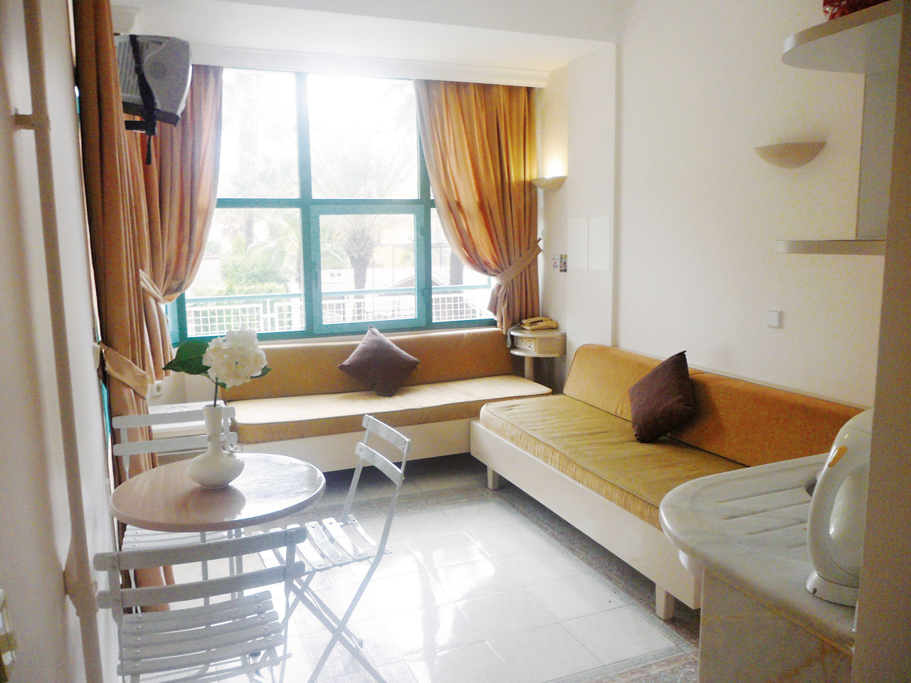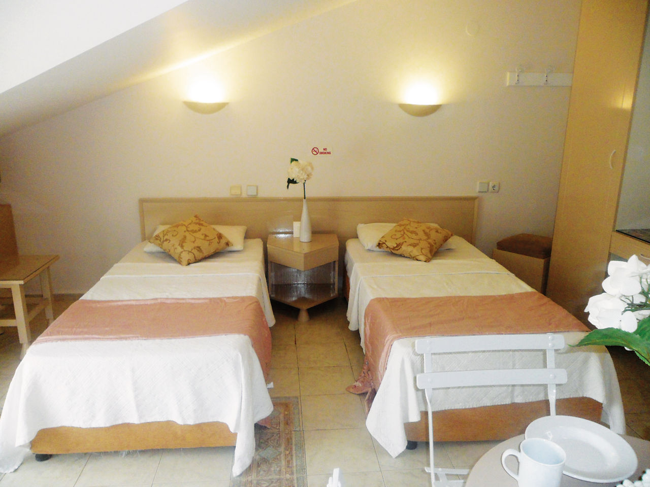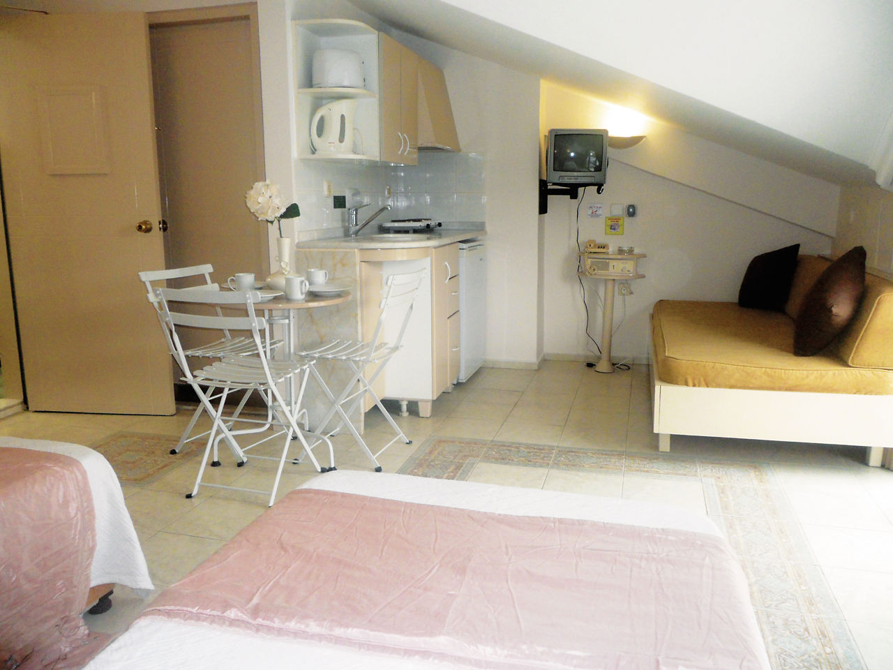 Standard Double and Twin rooms sleep up to 3 adults or 2 adults and 1 child and have a bathroom with shower, hairdryer, air conditioning*, satellite TV and a balcony or terrace. Studios sleep up to 3 adults or 2 adults and 1 child and have a bathroom with shower, hairdryer, air conditioning*, satellite TV, fridge, cooking rings and a balcony or terrace. Studios are on the fourth floor with sloping roofs. One Bedroom apartments, Self Catering and Half Board are also available.