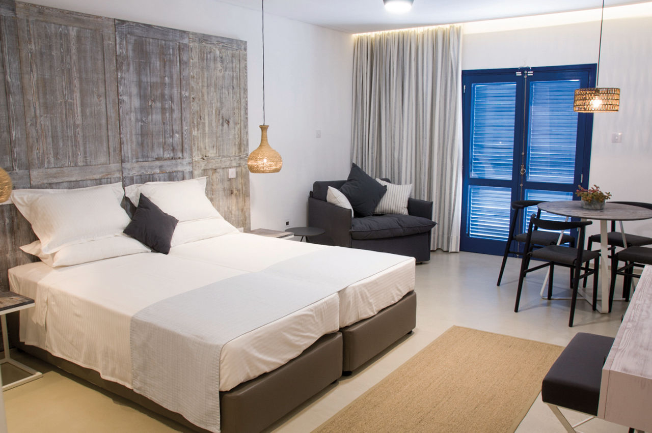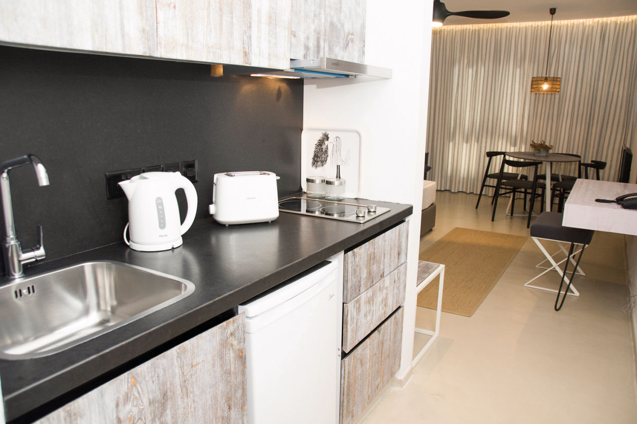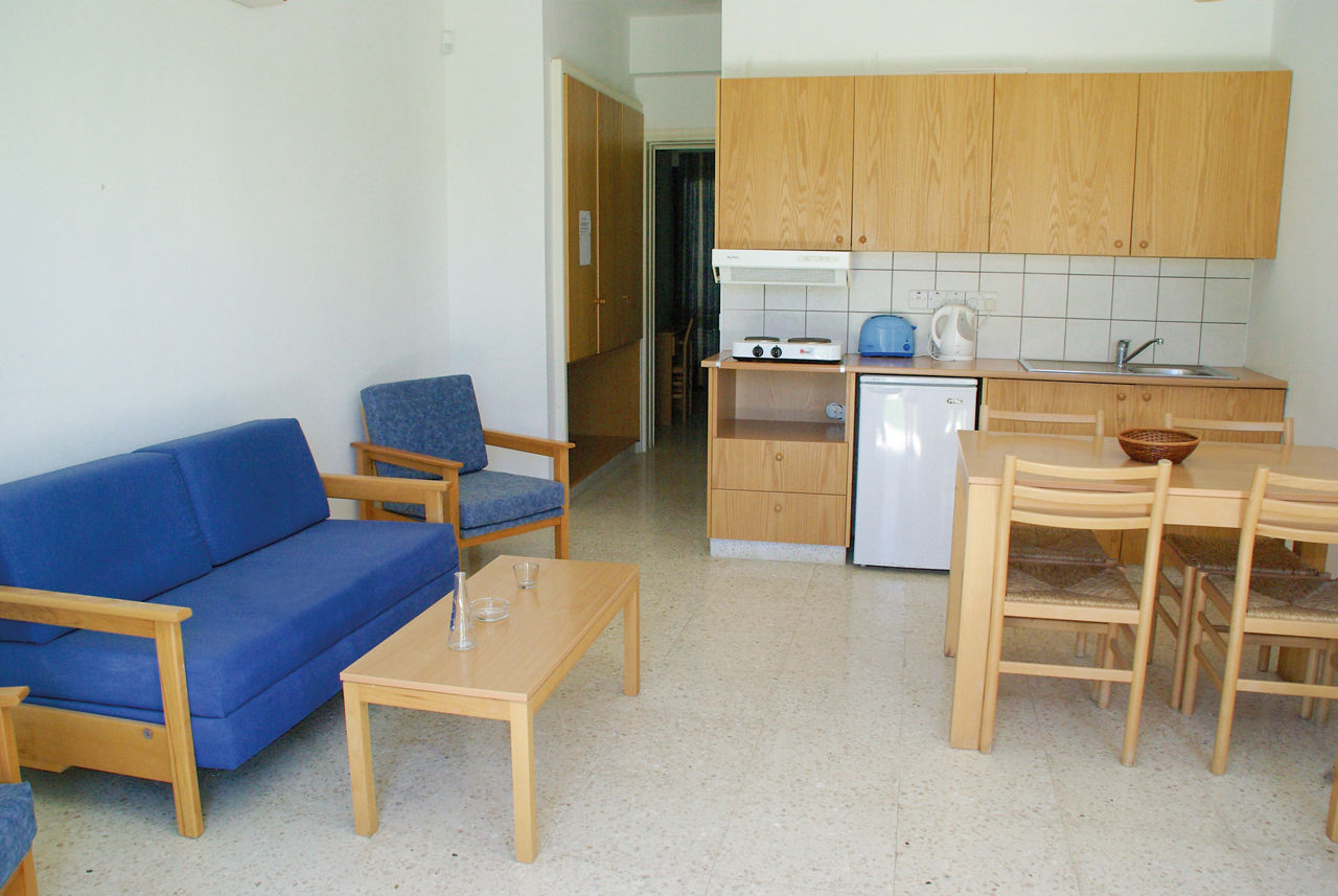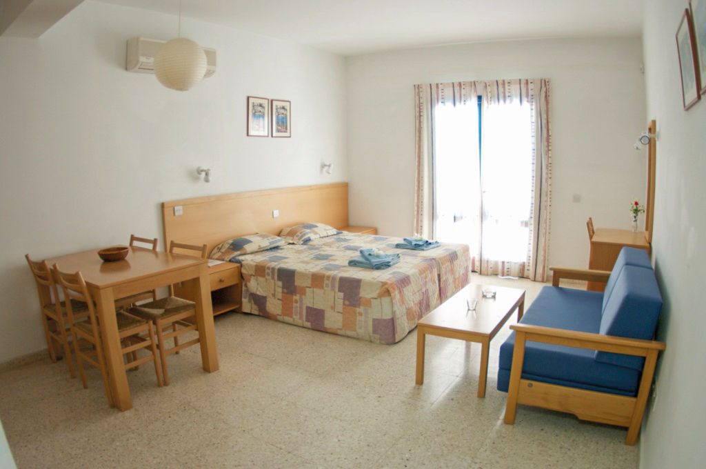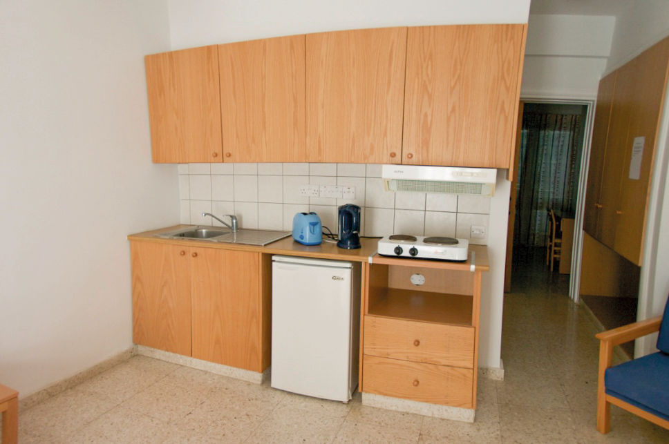 Studio apartments sleep up to 3 adults and have bathroom containing a bath with shower attachment, air conditioning*, safety deposit box*, tea and coffee making facilities, fridge, toaster, double cooking rings, and a balcony or terrace. Maisonette apartments sleeping up to 4 adults and One Bedroom apartments sleeping up to 4 adults are also available.