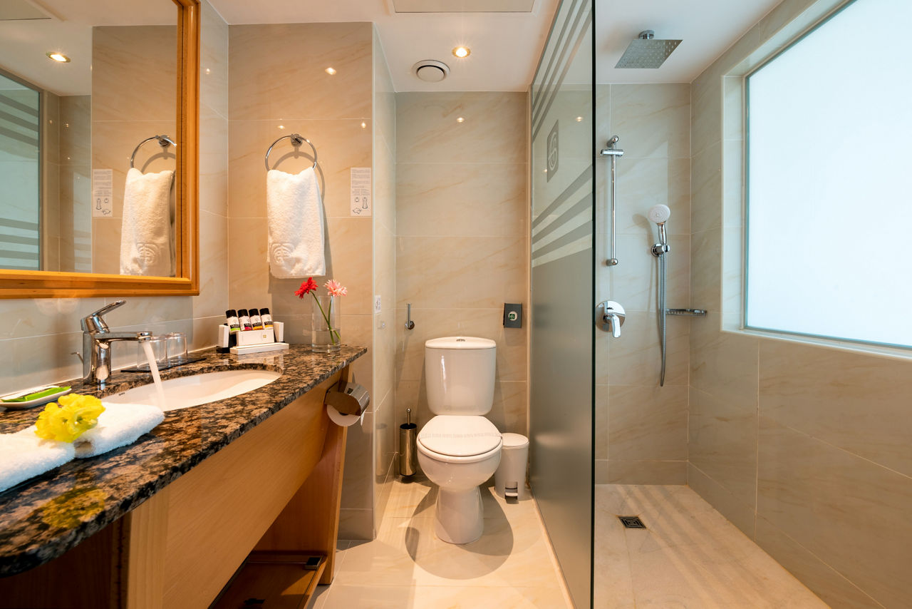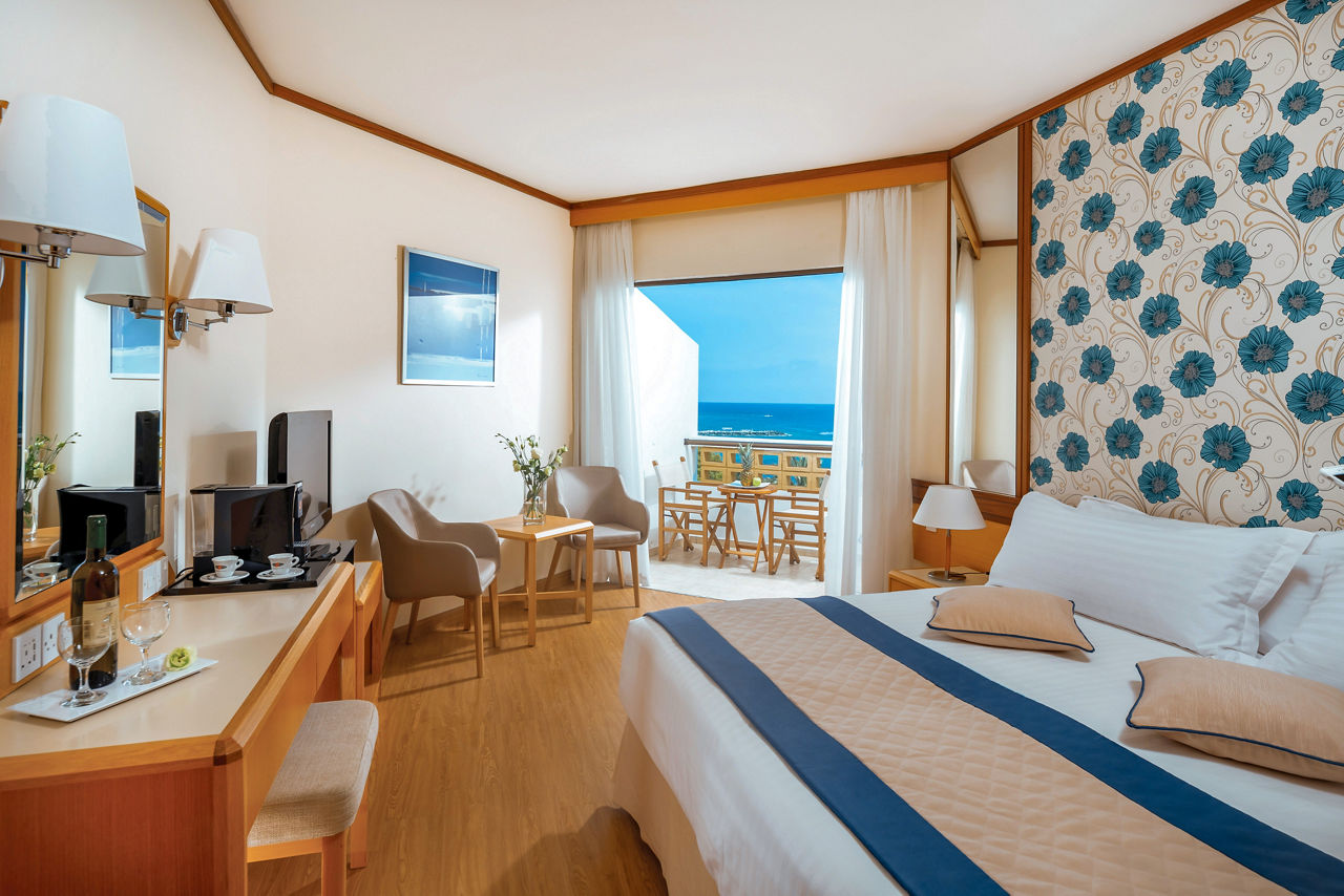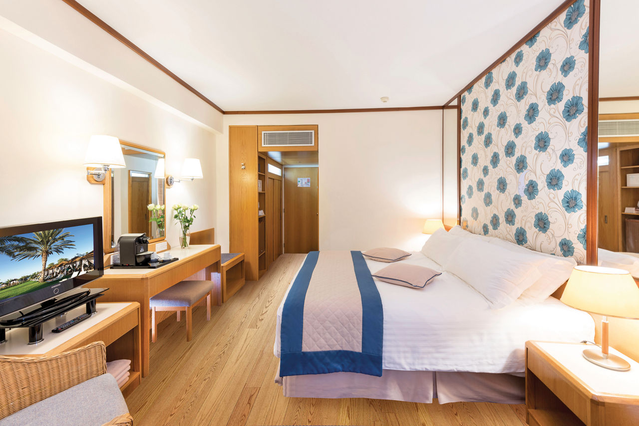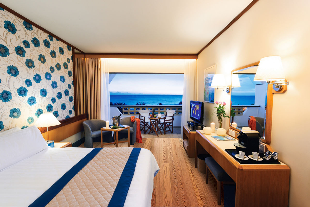 Standard Twin rooms sleep up to 2 adults and have bathroom containing a bath with shower attachment, air conditioning (May-Oct), hairdryer, fruit & wine upon arrival, flat screen television, tea and coffee making facilities (replenished daily), espresso machine, bathrobes, slippers and free use of sauna and steam bath. Standard Twin rooms with Limited Sea View and Standard Twin rooms with Sea View are also available. Superior Deluxe rooms featuring a separate VIP check-in area, DVD player, deluxe toiletries, Wi-Fi, late breakfast until 10:30am and the use of a private cabana on the beach, Superior Deluxe rooms with Sea View, Executive One Bedroom suites with Sea View and Standard Twin rooms with Limited Sea View for Sole Use are also available.