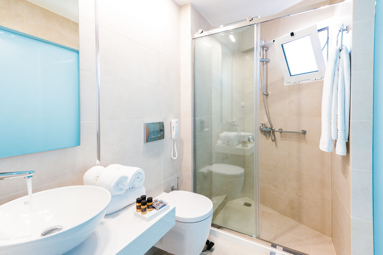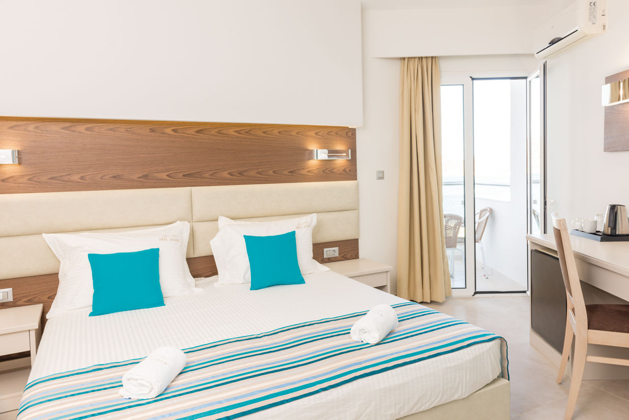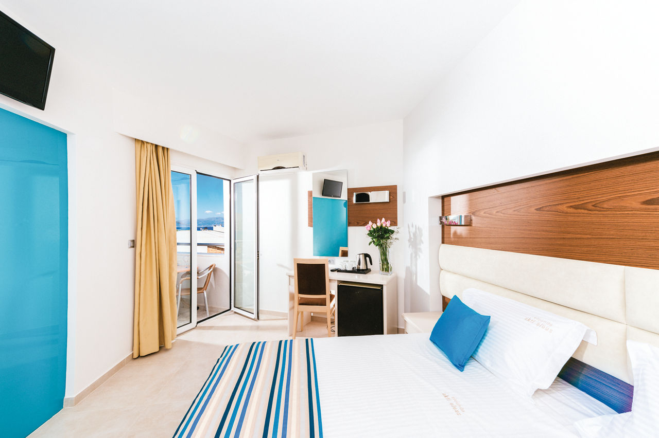 Twin and Double rooms sleep up to 3 adults or 2 adults and 1 child and have air-conditioning*, satellite TV, bathroom with bath or shower, hairdryer and a balcony. Double and Twin rooms with side sea view and single rooms are also available.