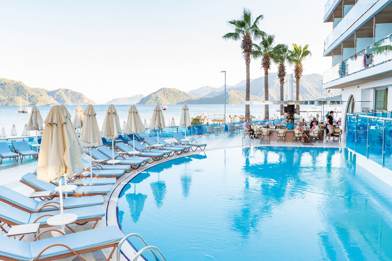 The Marbella Hotel is in a great location within easy reach of the centre of Marmaris and in a prime seafront spot with its own section of beach. This hotel is a fantastic choice for couples and friends wanting a relaxing getaway in this lively resort. Popular with repeat customers, it's easy to see why guests keep coming back once you arrive and experience a holiday at the Marbella Hotel.