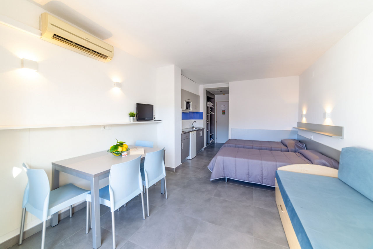 Studios sleep up to 3 adults or 2 adults and 2 children and have living/dining room with kitchenette with fridge, kettle, TV, air-conditioning, full bathroom and balcony.