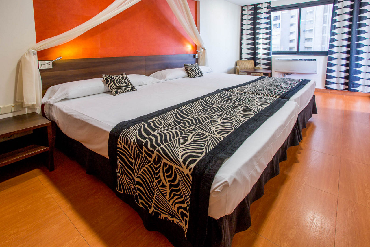 Twin rooms with Pool View sleep up to 3 adults and 1 child and have bathroom, hairdryer, air conditioning, satellite TV, fridge and kettle. Double and Twin rooms with Partial Sea View, Master Standard rooms with a lounge area sleeping up to 4 adults and 1 child, Double and Twin rooms with Partial Sea View for Sole Use and Single rooms are also available. Please Note: Rooms at this hotel do not have a balcony or terrace.