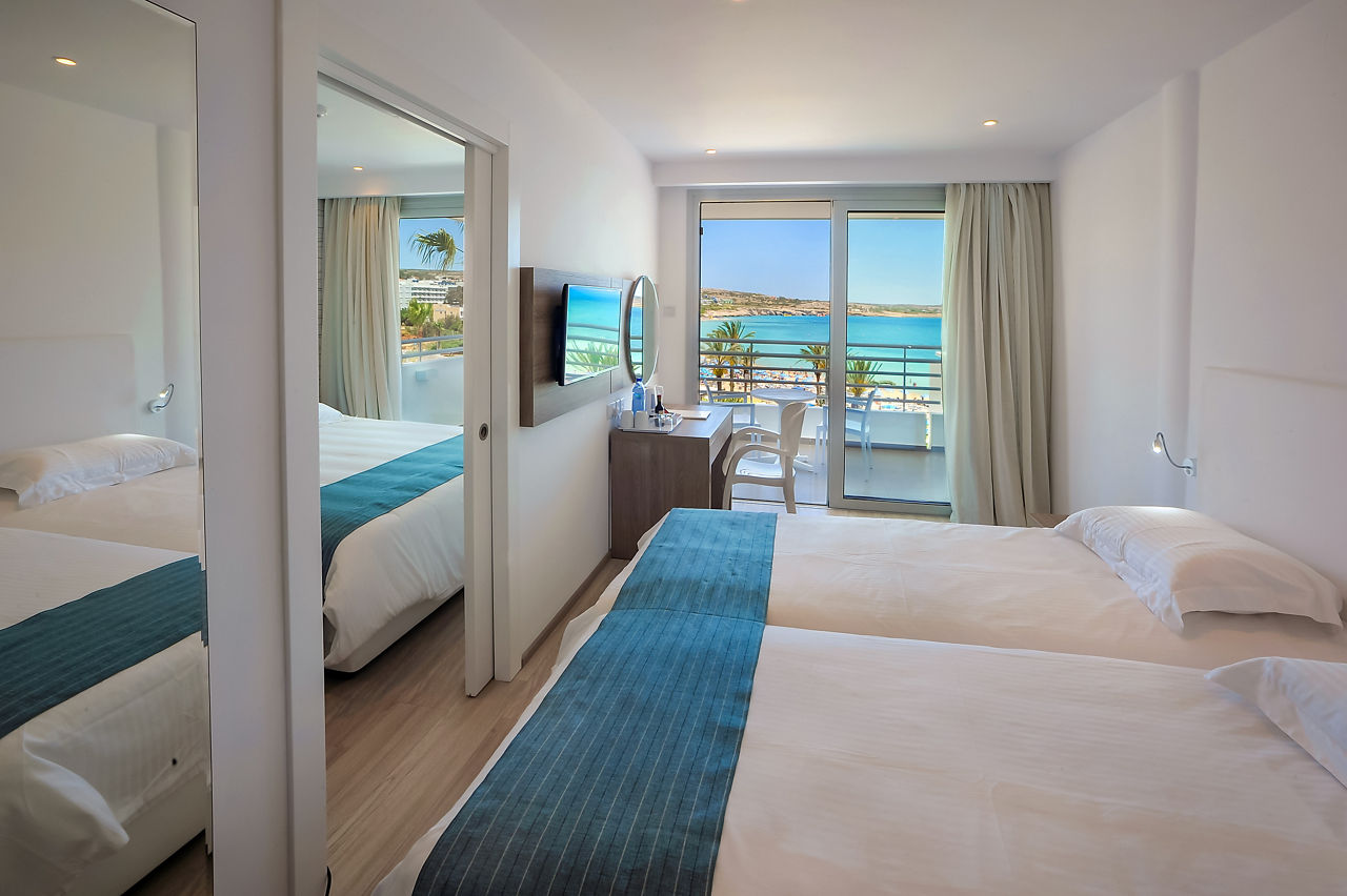 Twin rooms sleep up to 3 adults and have a bathroom with bath and shower, hairdryer, air conditioning, satellite TV and a balcony or terrace. Twin rooms with Sea View, Twin rooms with Sea View for Sole Use and Superior rooms (brand new for Summer 2015) with 32" satellite TV, free Wi-Fi and complimentary wine and water on arrival are also available.