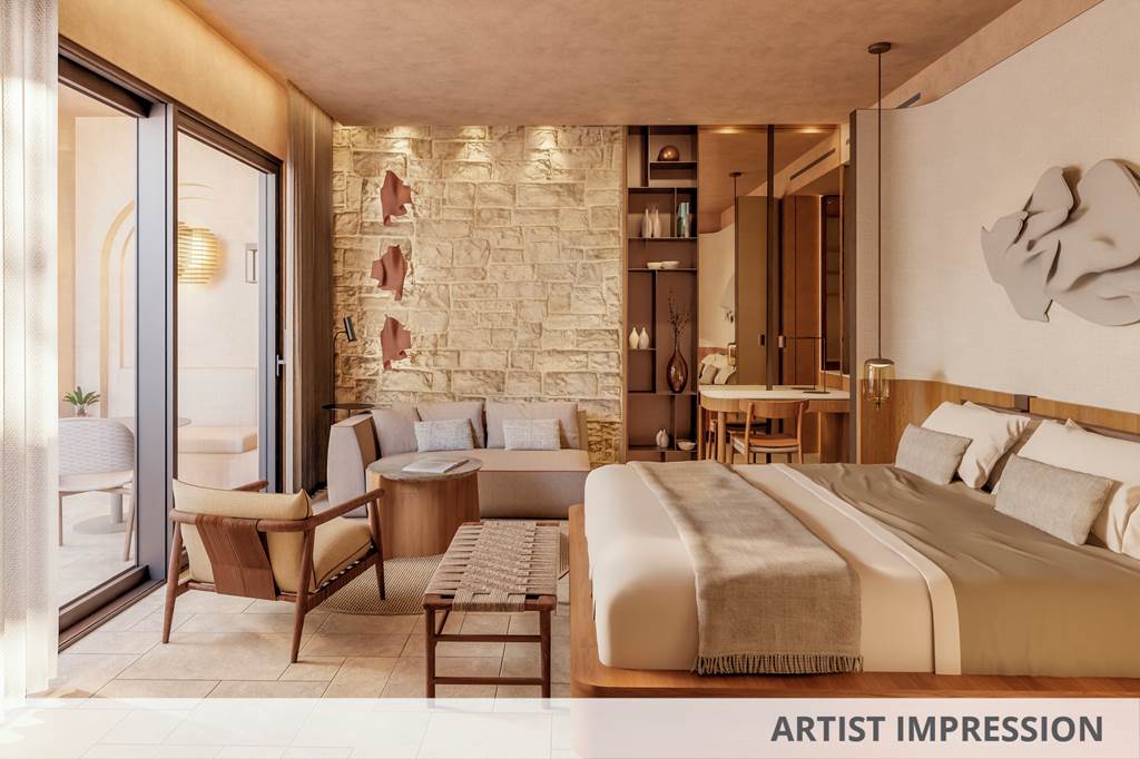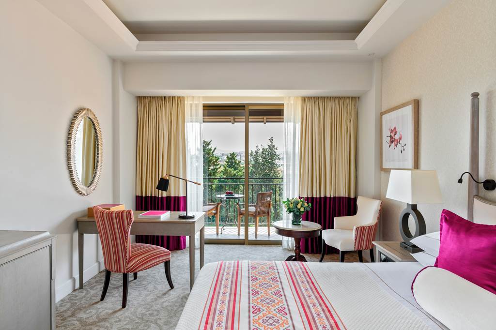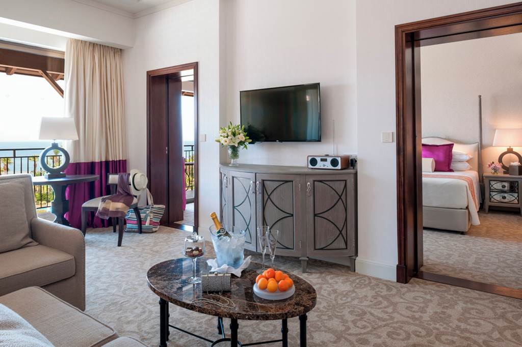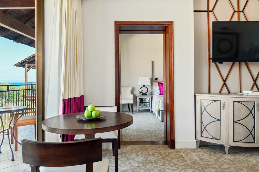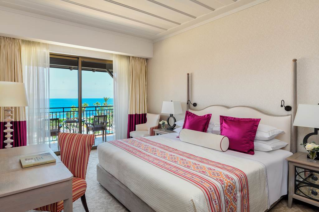 Deluxe rooms sleep up to 3 adults or 2 adults and 1 child and have a full bathroom, hairdryer, bathrobe and slippers, air conditioning/heating, flat screen satellite LCD TV, mini-bar*, Wi-Fi, tea & coffee making facilities and a balcony. Deluxe rooms with Side Sea View, Deluxe rooms with Sea View, Cyprian maisonettes with Garden, Cyprian maisonettes with Royal Garden View, Royal Garden villas with Private Pool and Garden View, Family suites sleeping up to 3 adults and 2 children, Family suites with Sea View, Royal studios (located on the first floor) and Deluxe rooms for Sole Use are also available. Cyprian maisonettes have a double height sitting room overlooked by a mezzanine sleeping gallery and consist of 1 bedroom, a separate shower room and a living area. Cyprian Maisonettes either open onto a private garden or onto the beautiful royal gardens.