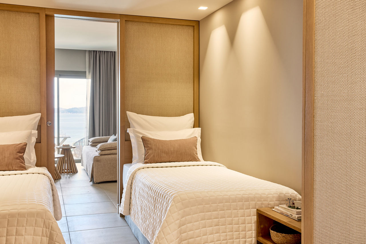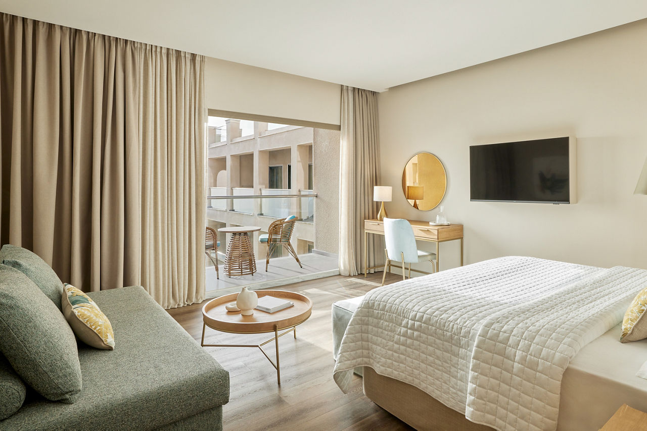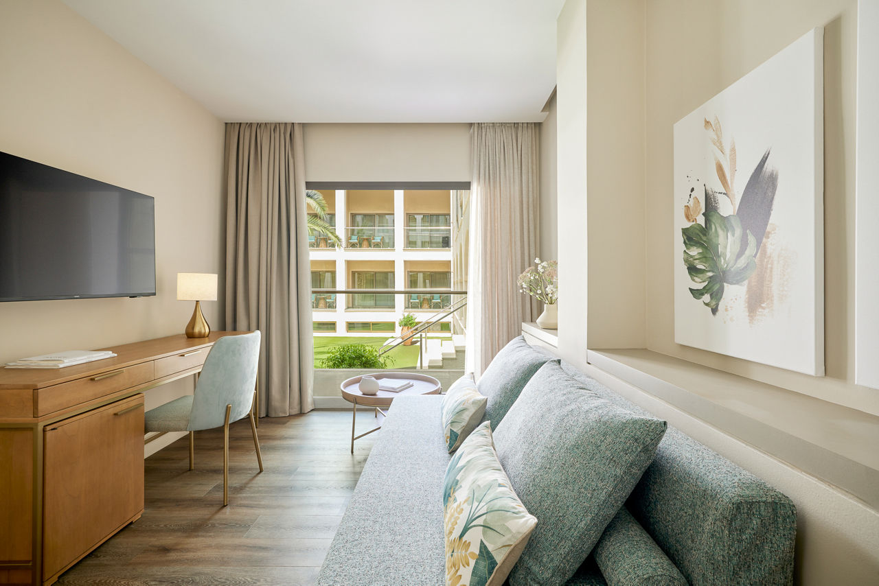 Double rooms with Garden View sleep up to 2 adults and have a bathroom with bath or shower, hairdryer, air conditioning, TV and balcony. Promotional Double rooms, Double rooms with Sea View, Superior Double rooms with Garden View sleeping up to 3 adults, Superior Double room with Sea View, Family Rooms with Garden View, Family rooms with Sea view, Superior Family rooms sleeping up to 4 adults with Garden View, Superior Family room with Sea View, Junior Suite with Sea View, Junior Panorama suite with Sea View and whirlpool, Suite with Sea View, Two bedroom suite with Sea View, Double room with Garden View for Sole use and Double room with Sea View for Sole use, Half Board, Full Board and Full Board Plus are also available.