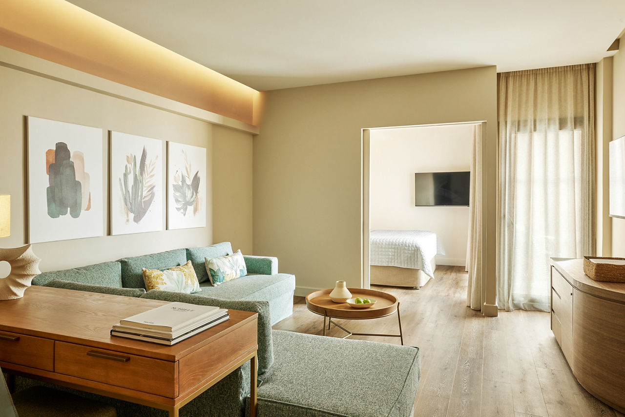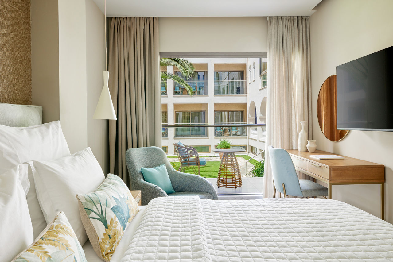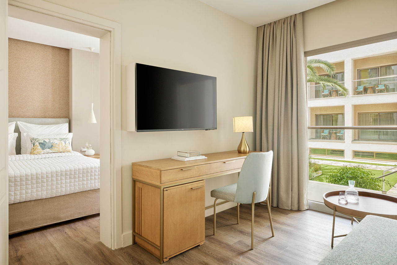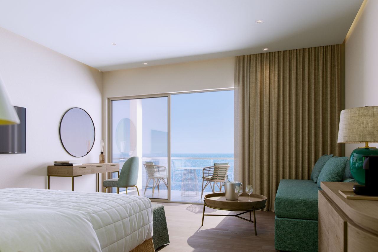 Double rooms with Garden View sleep up to 2 adults and have a bathroom with bath or shower, hairdryer, air conditioning, TV and balcony. Promotional Double rooms, Double rooms with Sea View, Superior Double rooms with Garden View sleeping up to 3 adults, Superior Double room with Sea View, Family Rooms with Garden View, Family rooms with Sea view, Superior Family rooms sleeping up to 4 adults with Garden View, Superior Family room with Sea View, Junior Suite with Sea View, Junior Panorama suite with Sea View and whirlpool, Suite with Sea View, Two bedroom suite with Sea View, Double room with Garden View for Sole use and Double room with Sea View for Sole use, Half Board, Full Board and Full Board Plus are also available.