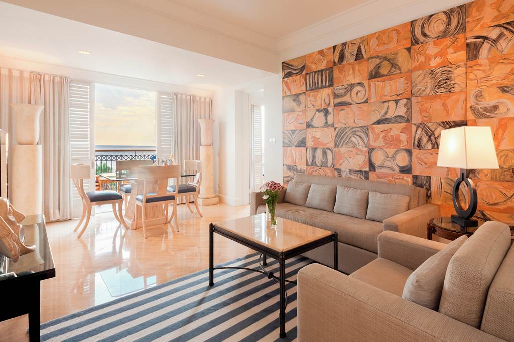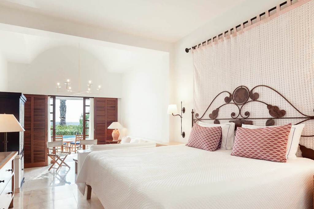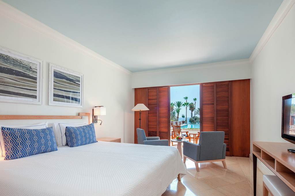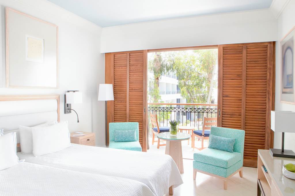 Standard rooms sleep 2 adults and have bathroom containing a bath, air conditioning (Apr-Oct) hairdryer, bathrobe and slippers, flat screen television and balcony. Standard rooms with Sea View, Terrace rooms with Garden View or Sea View, Deluxe rooms with Sea View all sleeping up to 3 adults, Garden Studio suite, Garden Studio suite with Whirlpool sleeping 2 adults, Studio Suite with Private Plunge Pool sleeping up to 3 adults, Deluxe Two Bedroom suite sleeping up to 6 adults, Family rooms and Family studios sleeping 2 adults and 2 children, Sole Use rooms and Single Parent rooms are also available.