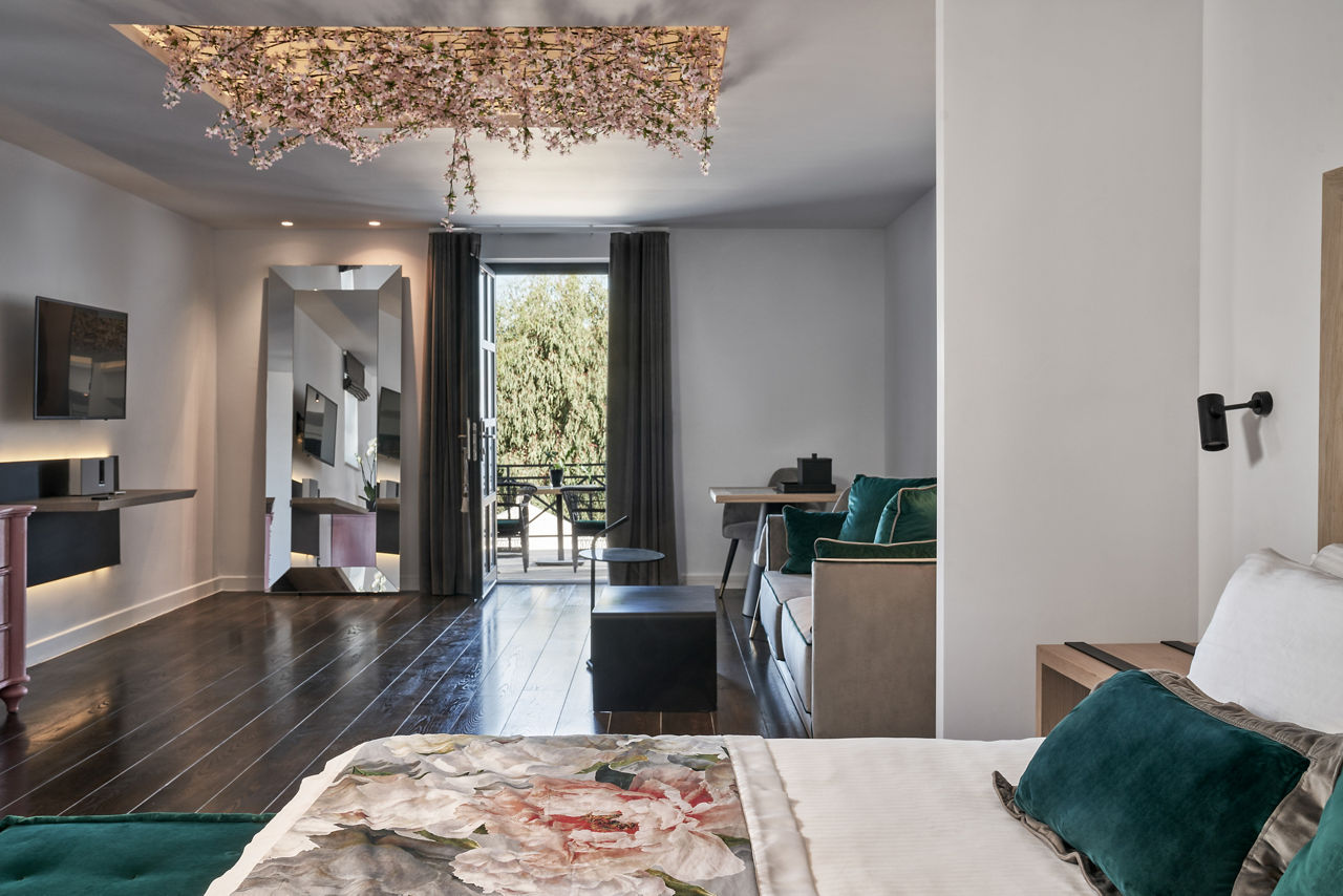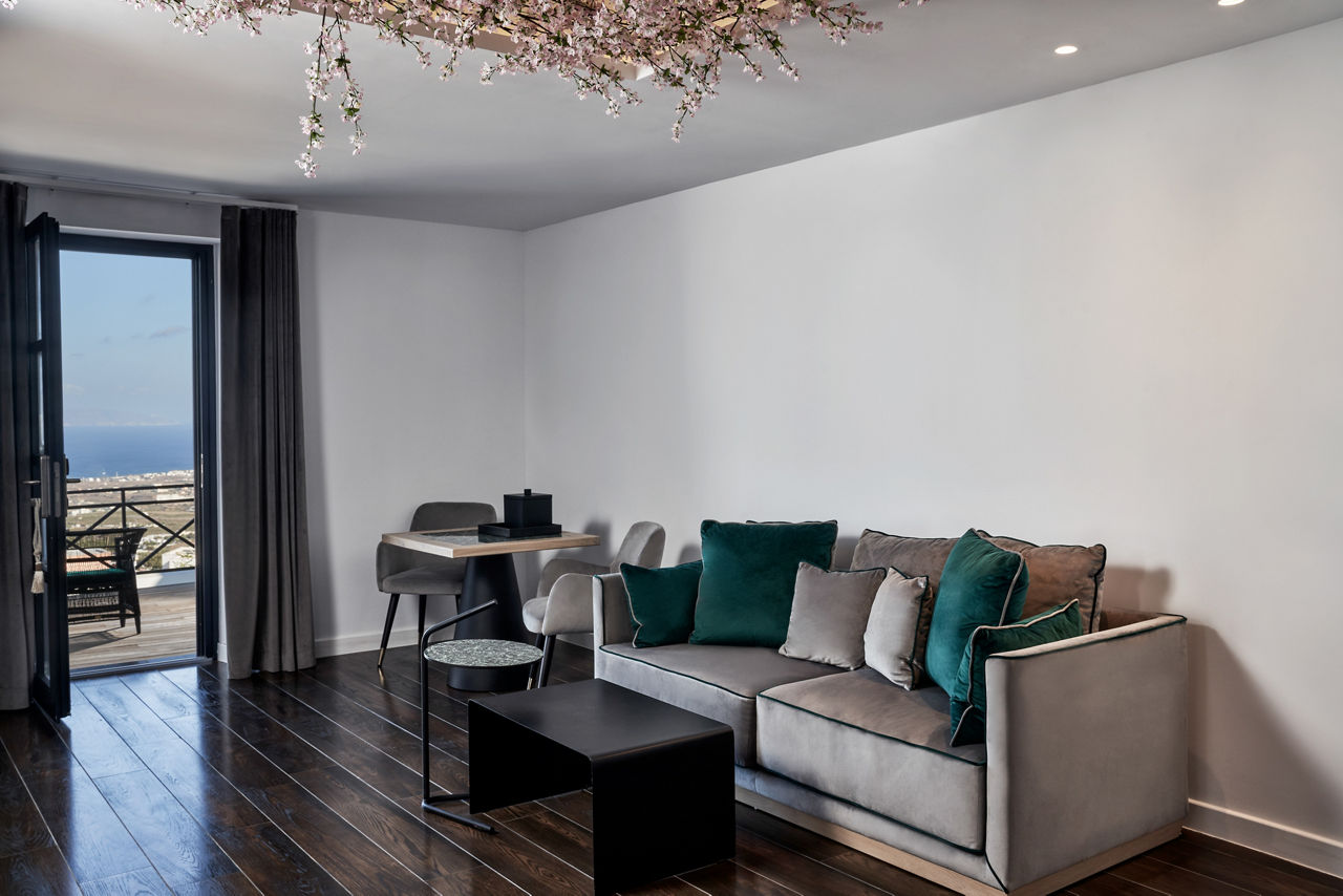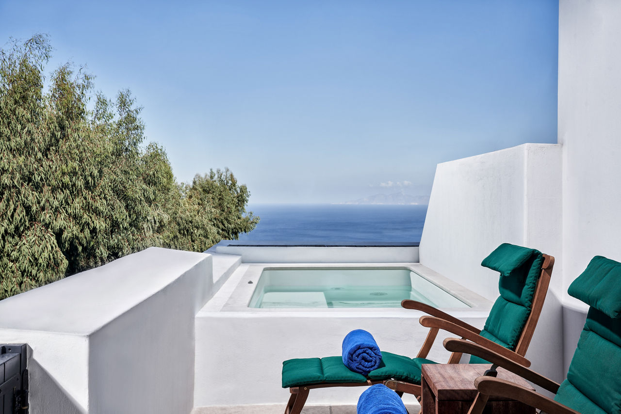 Junior suites sleep up to 3 adults and have bathroom containing a bath or shower, air conditioning, hairdryer, bathrobe and slippers, flat screen television, coffee making facilities and terrace. Senior suites with Private Whirlpool, Senior suites with Private Whirlpool and Sea View and Superior suite with Garden and Private Pool are also available.