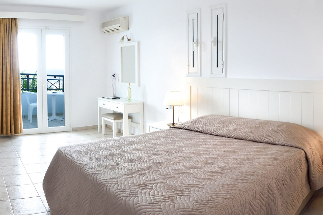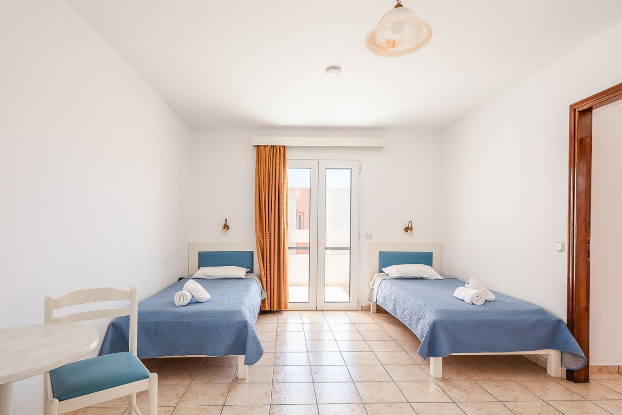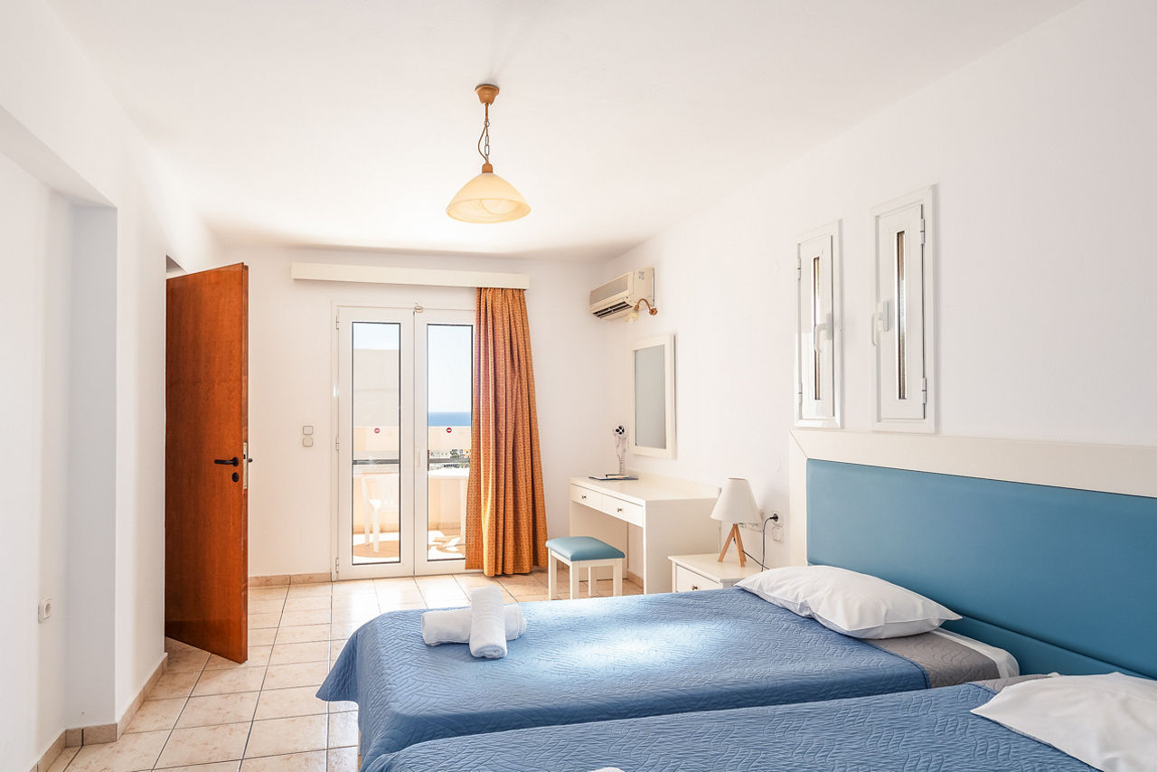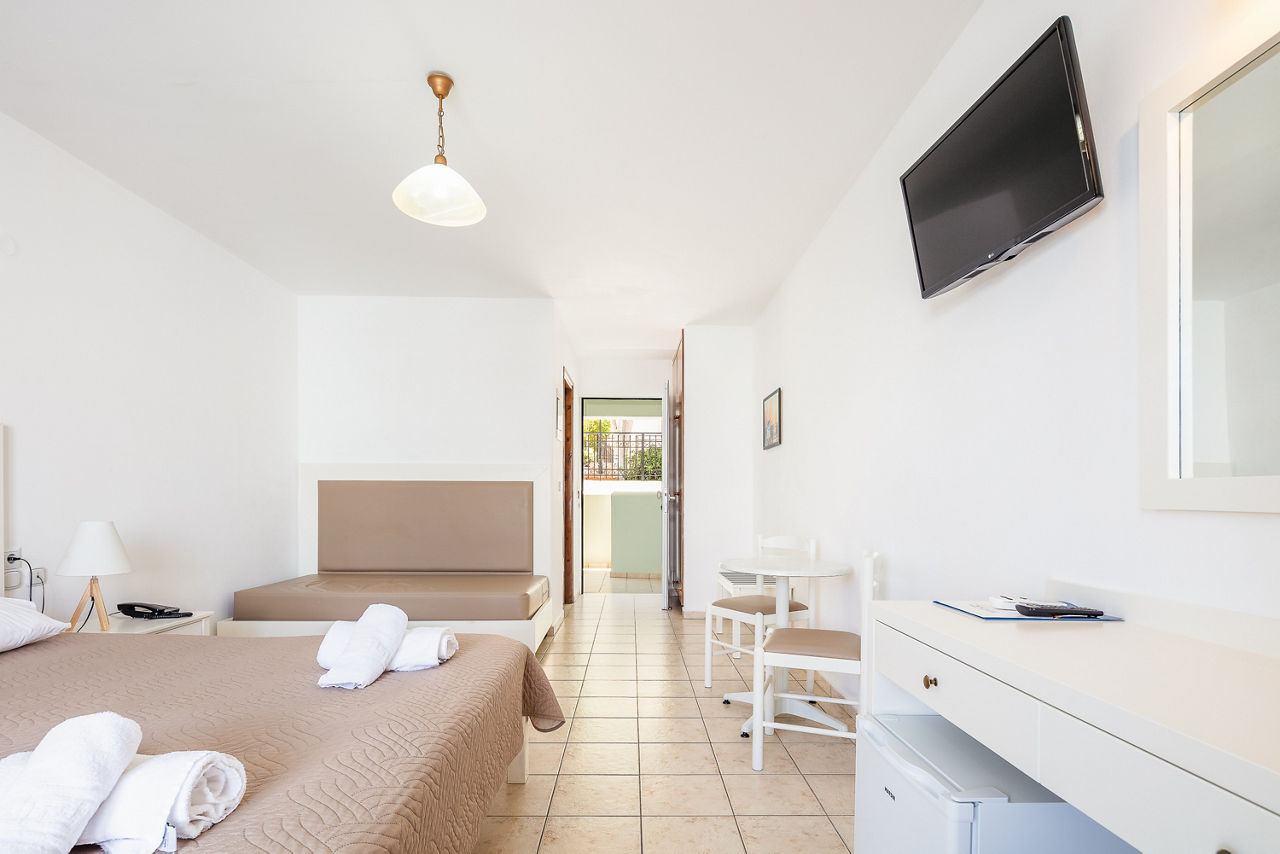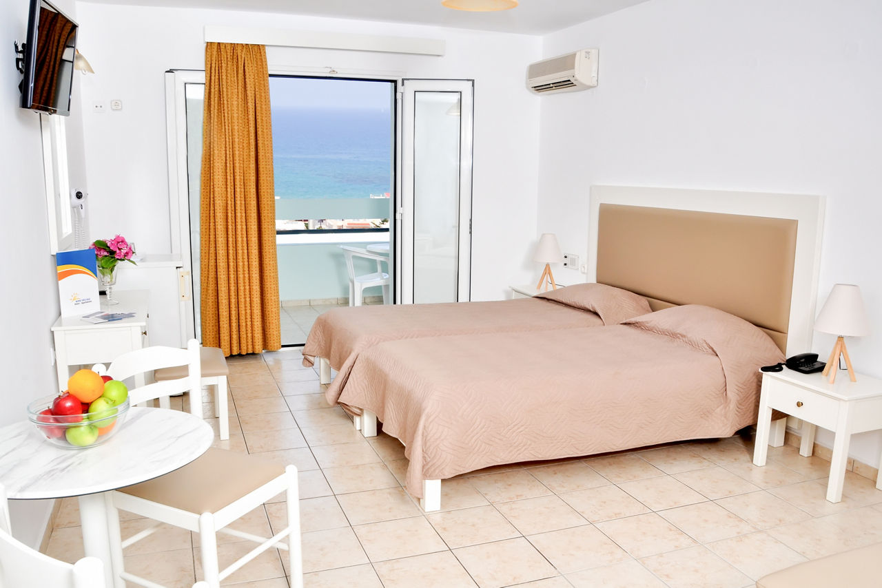 Studios sleep up to 3 people and have bathroom (most rooms have a bathtub and a few rooms have a shower) kitchenette (2 cooking rings, fridge and cooking utensils), filter Coffee Maker, satellite TV, air- conditioning*, hairdryer and balcony or terrace overlooking either the sea, the garden or the landscape. One bedroom apartments sleeping up to 4 people are also available.