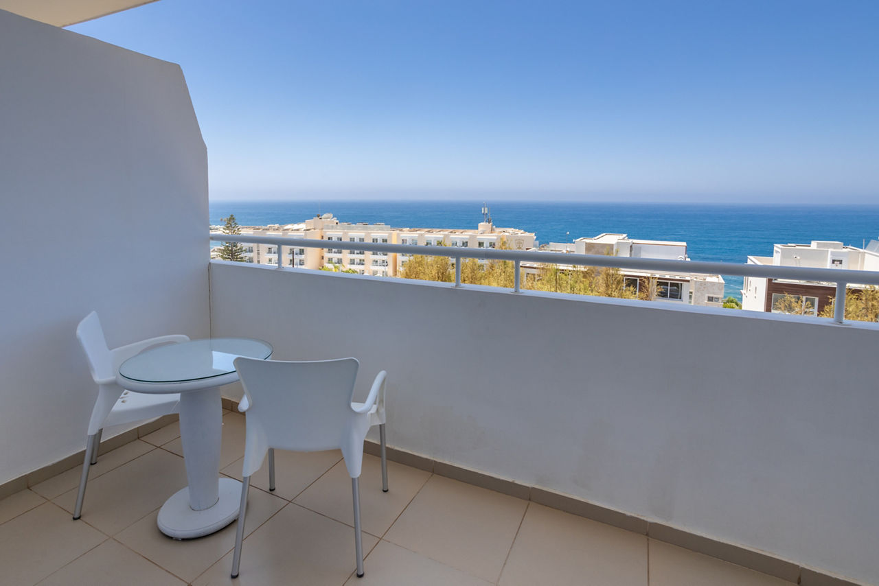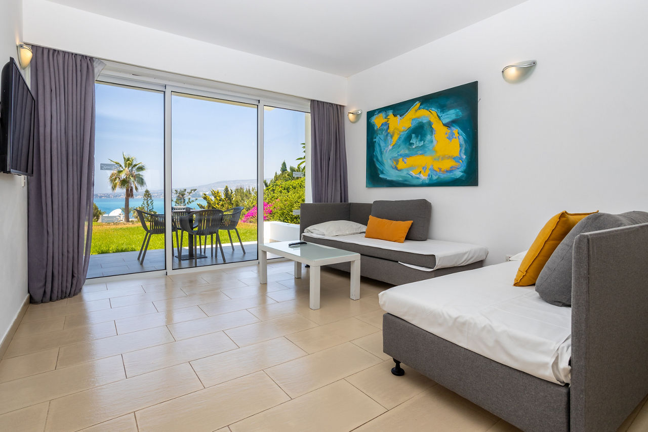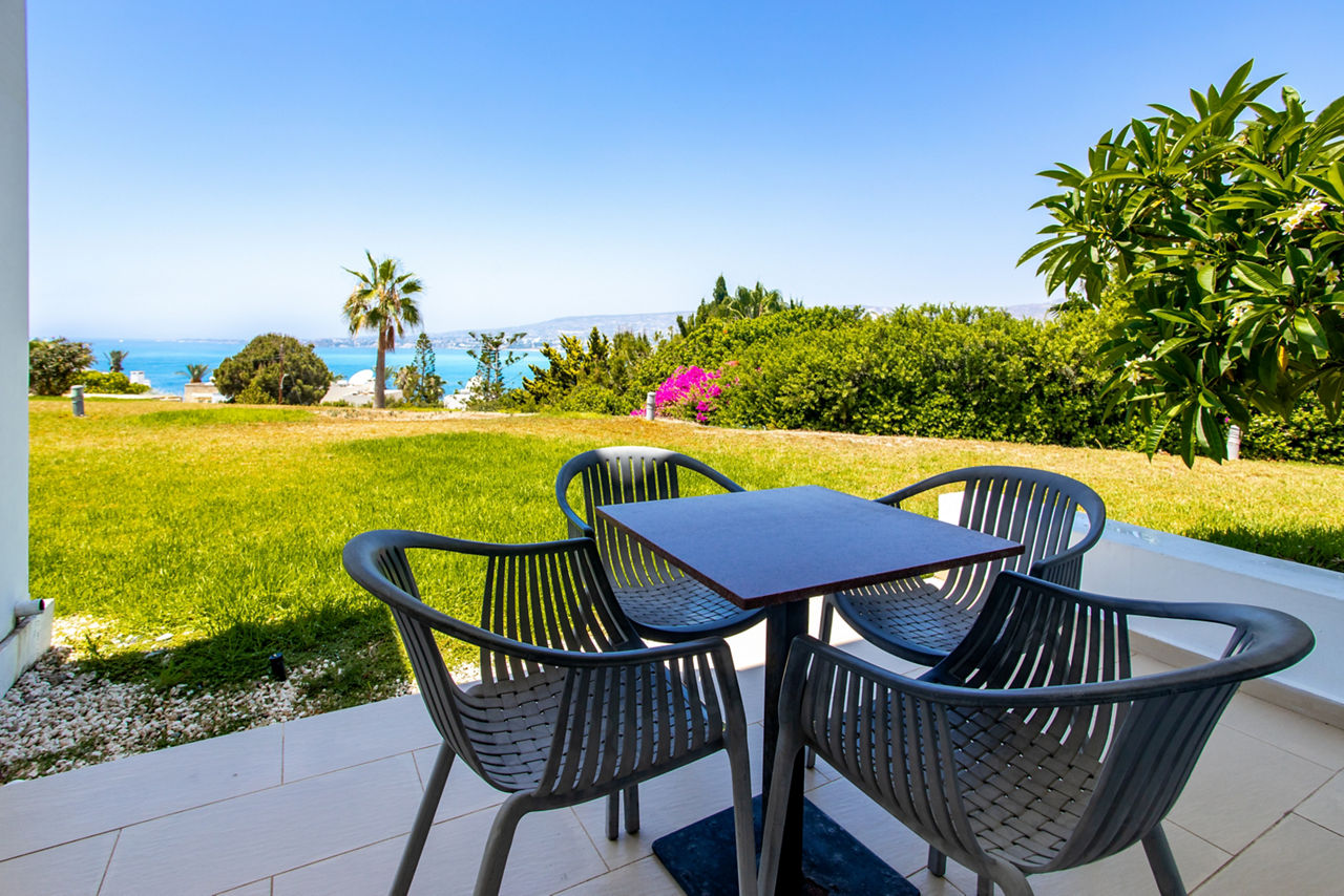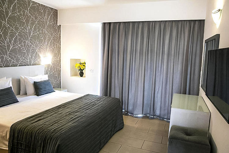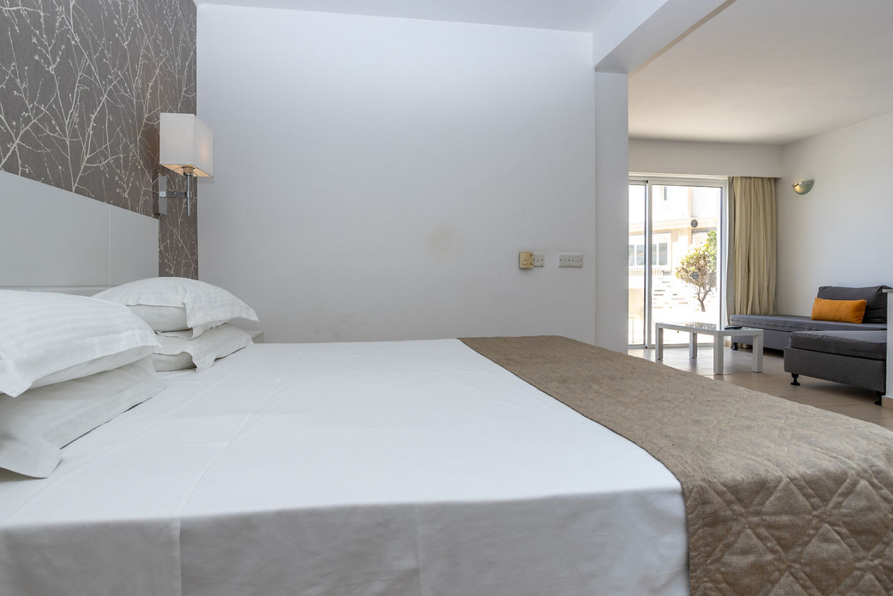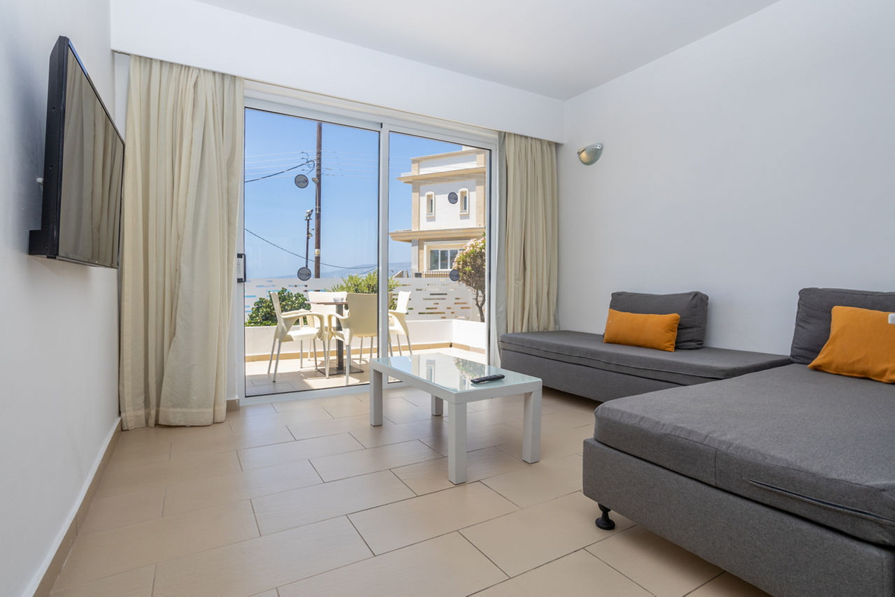Studios sleep up to 3 adults and have bathroom containing a bath with shower attachment, air-conditioning, hairdryer, flat screen television, fridge, double cooking rings, toaster, kettle and a balcony or terrace. Sea View studios and One Bedroom apartments with Inland View or Sea View sleeping up to 4 adults are also available. Half Board, Full Board and All Inclusive are also available.