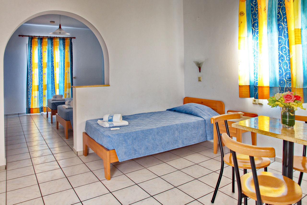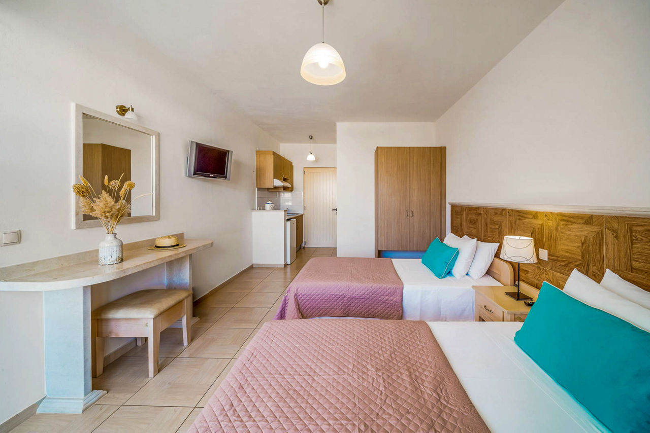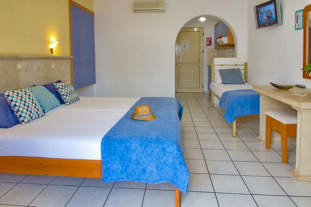 Standard Twin Studios sleep up to 2 adults and have bathroom containing a shower, air conditioning*, hairdryer, flat screen television, fridge, kettle, coffee making facilities and balcony or terrace. Standard Triple Studios and Superior Double studios are also available.