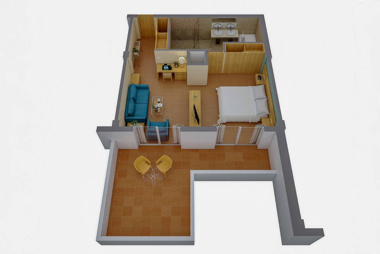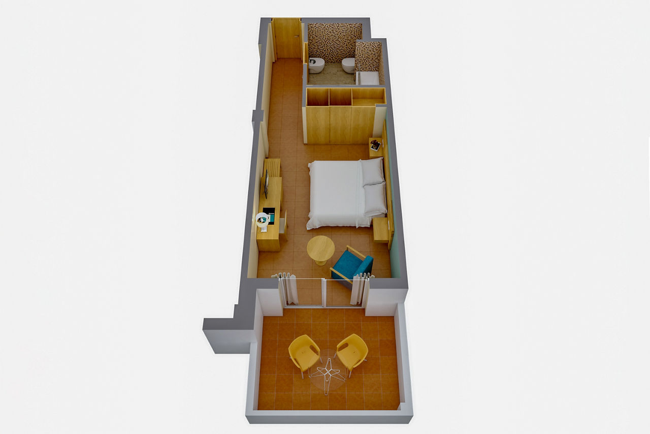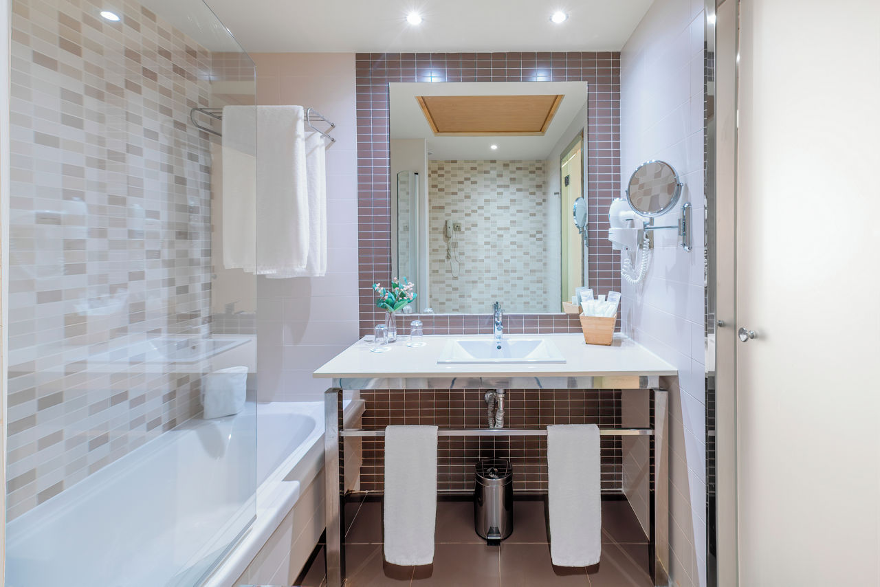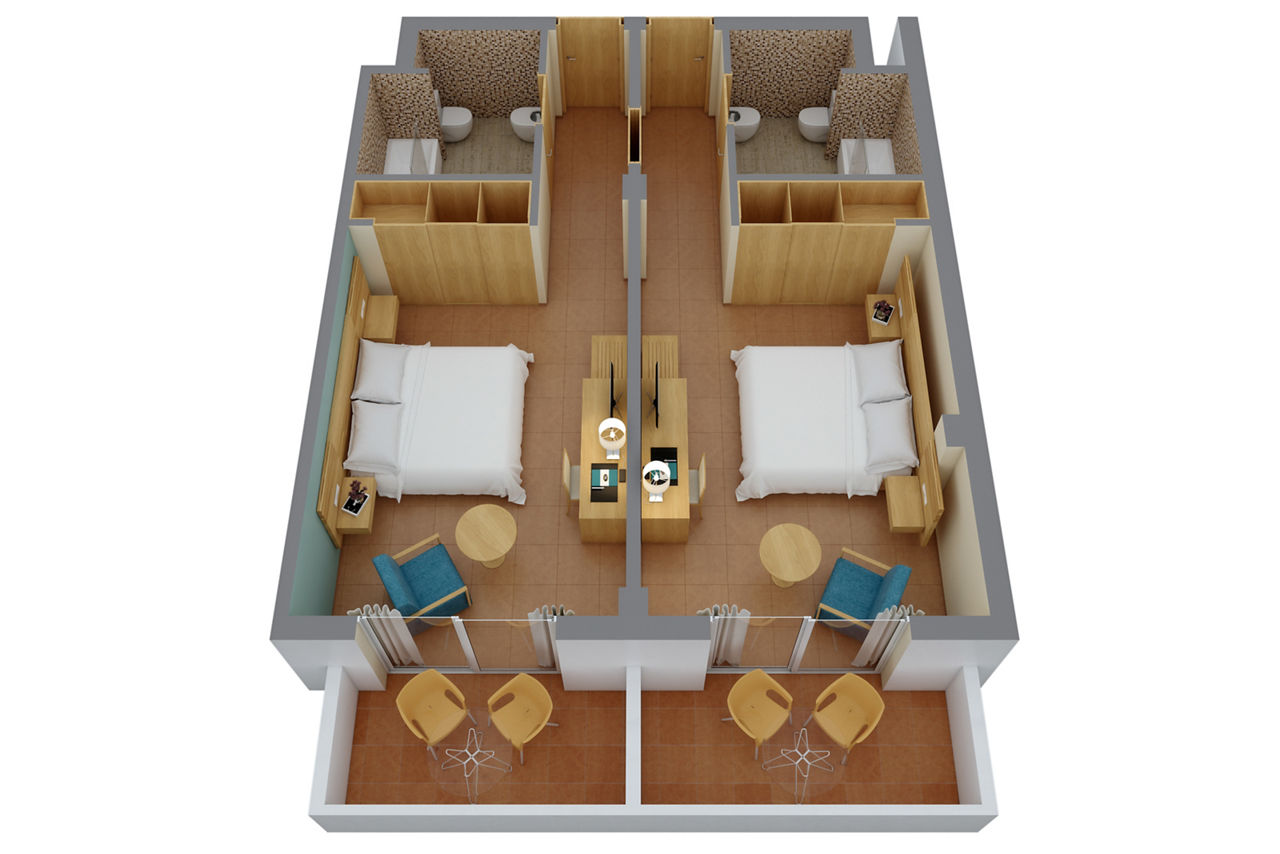 Double rooms sleep up to 3 adults and have bathroom containing a bath with shower attachment, air conditioning, hairdryer, flat screen television, tea and coffee making facilities and balcony or terrace. Family rooms, sleeping up to 4 adults and 2 children, Junior suites and Senior suites, both including a whirlpool bath, are also available.