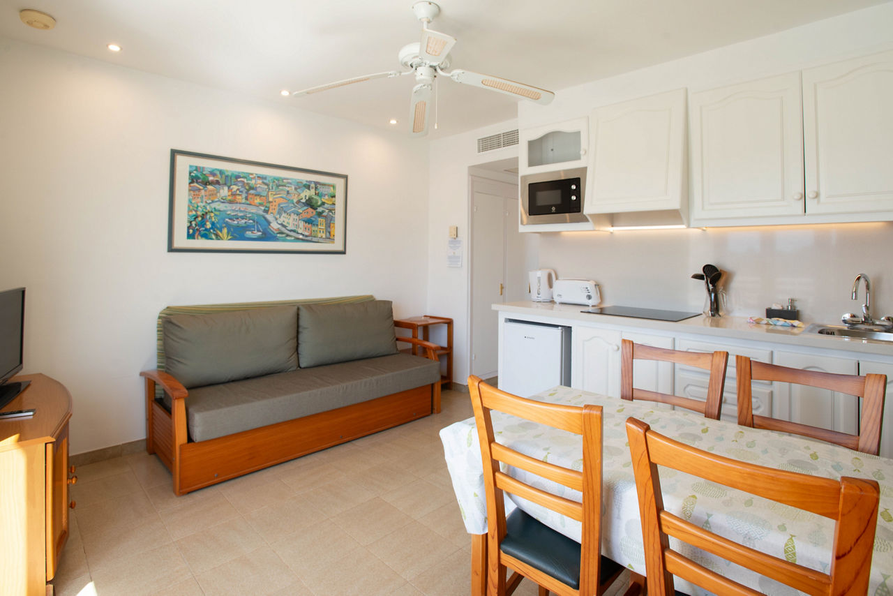 One bedroom apartments sleep up to 3 adults and 1 child and have air-conditioning, satellite TV, fully equipped kitchen, kettle, fridge, toaster, full bathroom and a balcony or terrace.