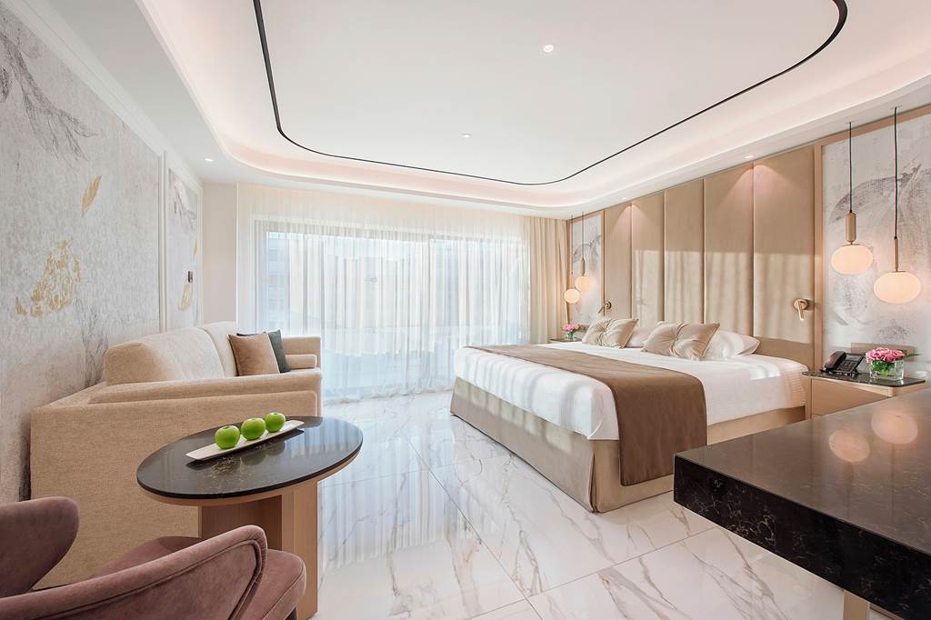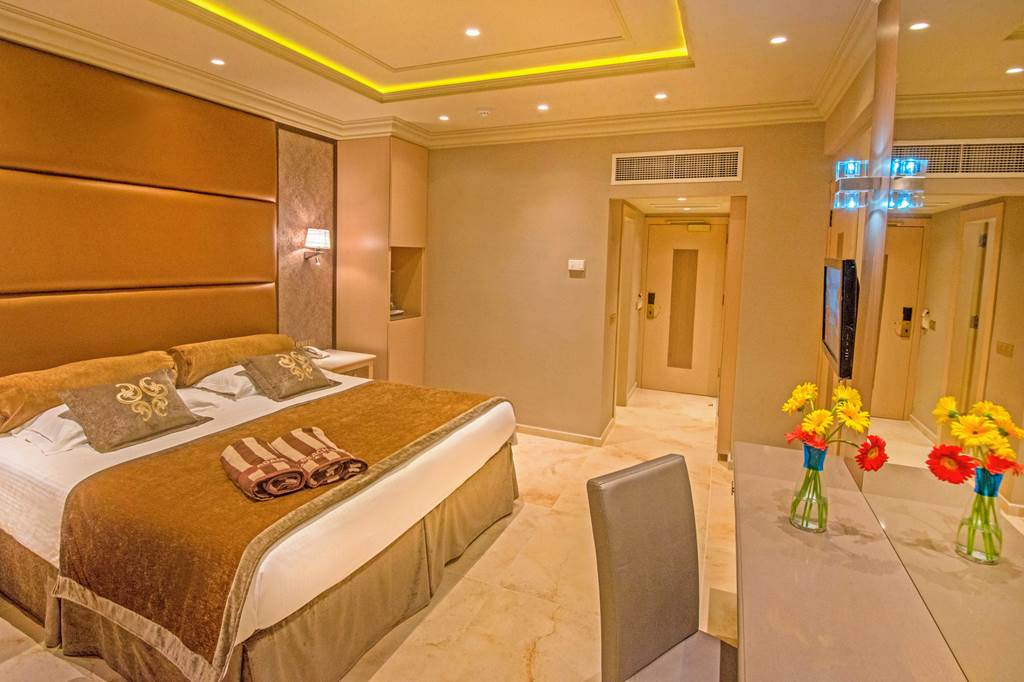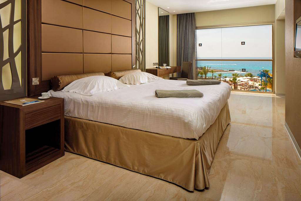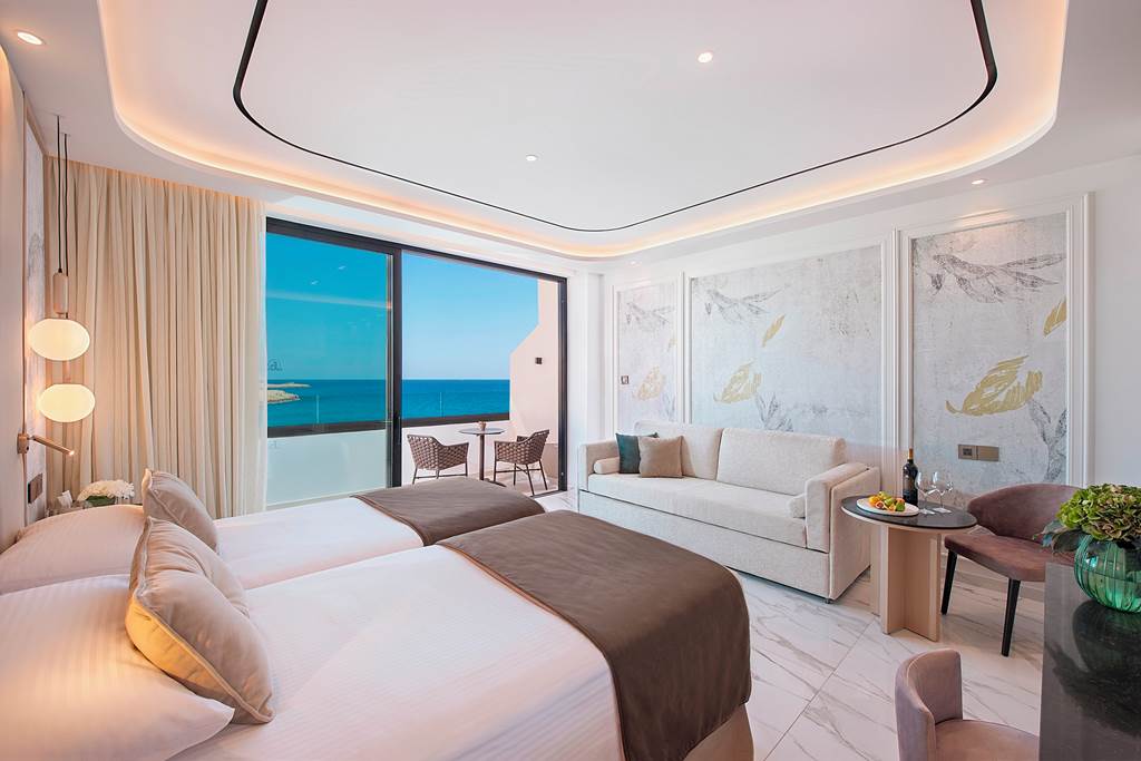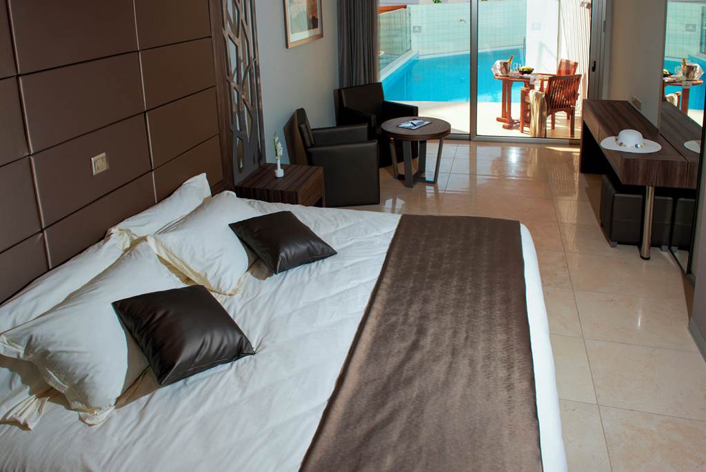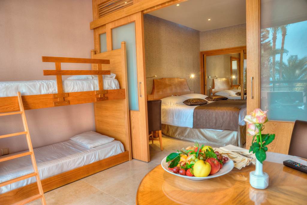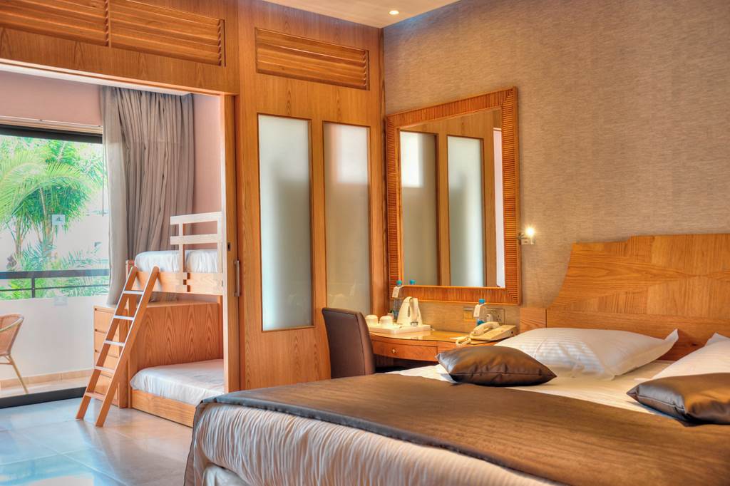 Classic rooms sleep up to 2 adults and 1 child and have bathroom containing a bath with shower attachment, air conditioning, hairdryer, flat screen television and a balcony or terrace. Classic rooms with Sea View, Superior rooms sleeping up to 3 adults or 2 adults and 2 children have the same facilities as the Classic rooms, but are larger in size and also include a small dining table and chairs with either an Inland View or a Side Sea View, Junior suites sleeping up to 3 adults and 2 children have the same facilities as Superior rooms, plus free Wi-Fi, free safety deposit box, tea and coffee making facilities, and are also larger in size and have an en-suite bathroom with a bath and shower, plus a separate walk-in shower, Queen suites have the same facilities as Junior suites but are larger in size and are located in the gardens of the hotel and Classic rooms for Sole Use are also available.
