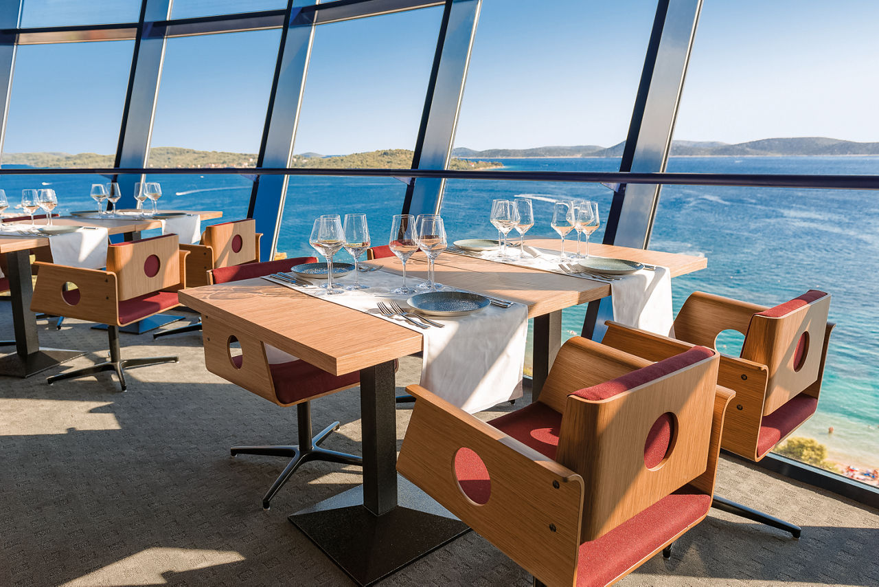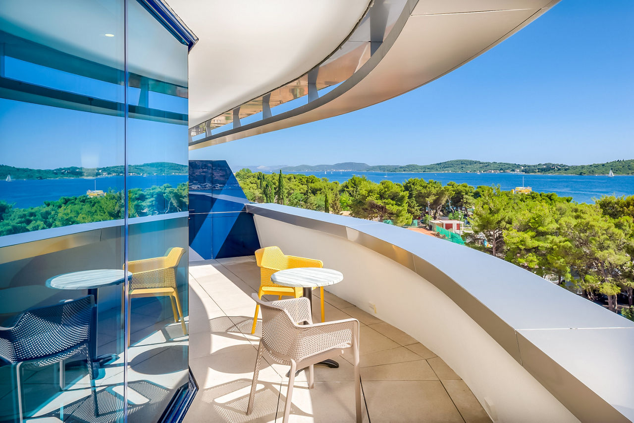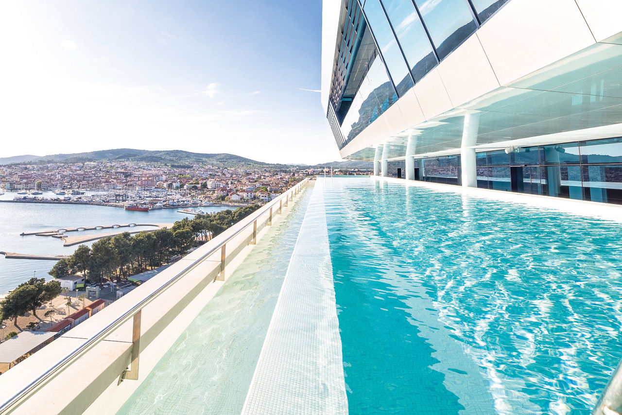 Hotel Olympia Sky boasts iconic architecture and offers stunning panoramic views of the Adriatic Sea. The hotel features a luxurious spa, a large gym and a main pool with a swim-up bar, perfect for unwinding. Its sleek design extends to spacious rooms and a rooftop restaurant, where guests can enjoy breathtaking coastal scenery. Just steps from the shore, guests can easily explore Vodice, a charming town known for its lovely beaches, lively harbour scene, and a rich selection of historical sights.