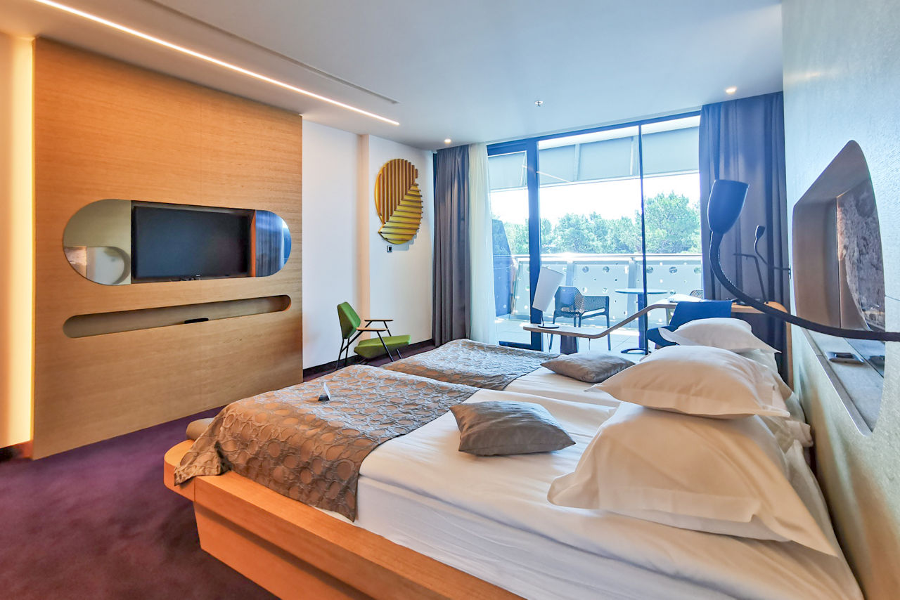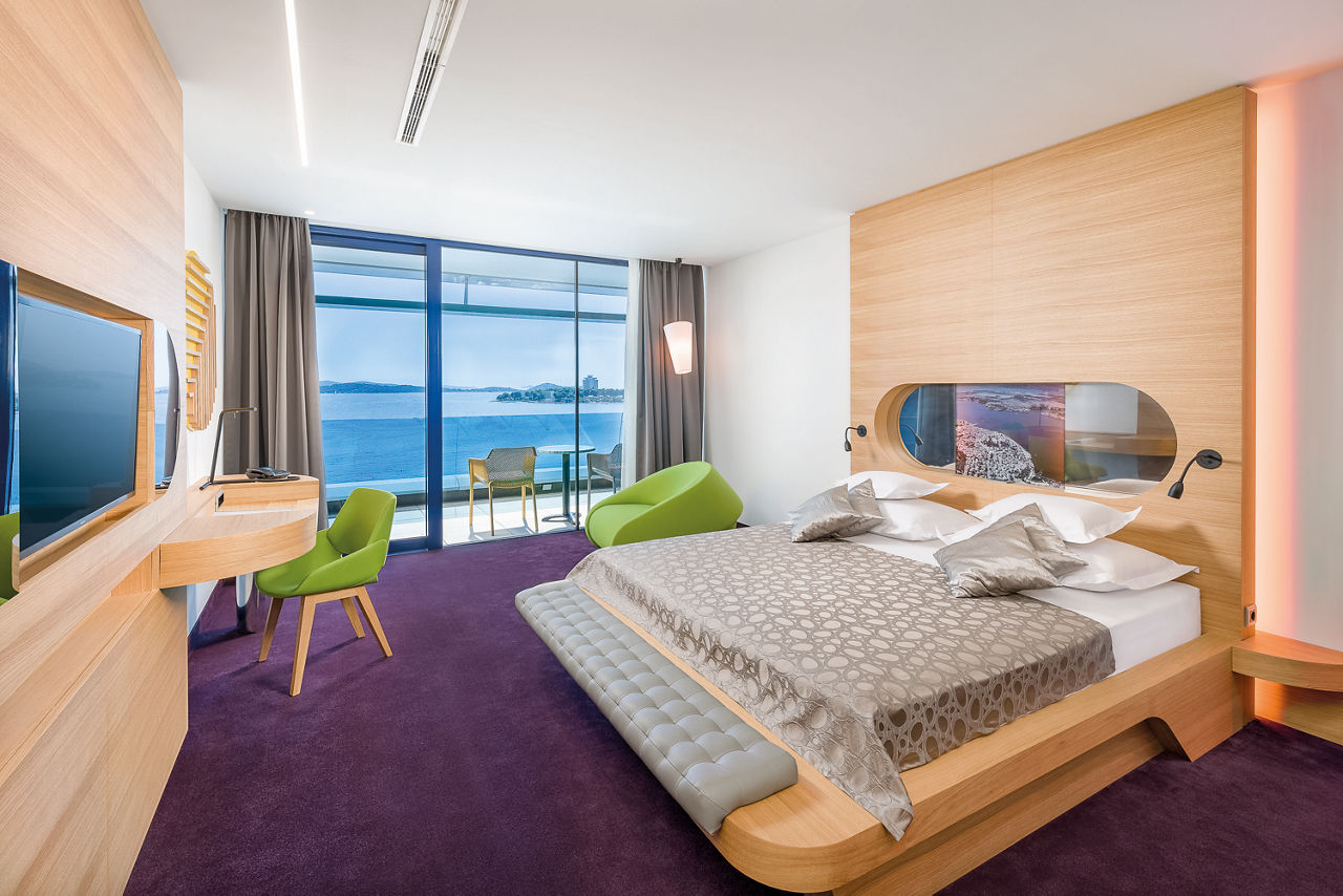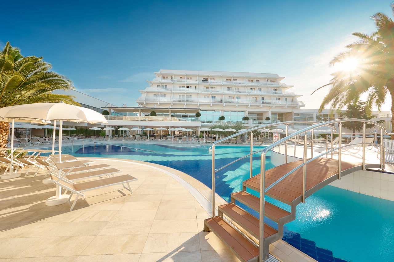Hotel Olympia Sky boasts iconic architecture and offers stunning panoramic views of the Adriatic Sea. The hotel features a luxurious spa, a large gym and a main pool with a swim-up bar, perfect for unwinding. Its sleek design extends to spacious rooms and a rooftop restaurant, where guests can enjoy breathtaking coastal scenery. Just steps from the shore, guests can easily explore Vodice, a charming town known for its lovely beaches, lively harbour scene, and a rich selection of historical sights.