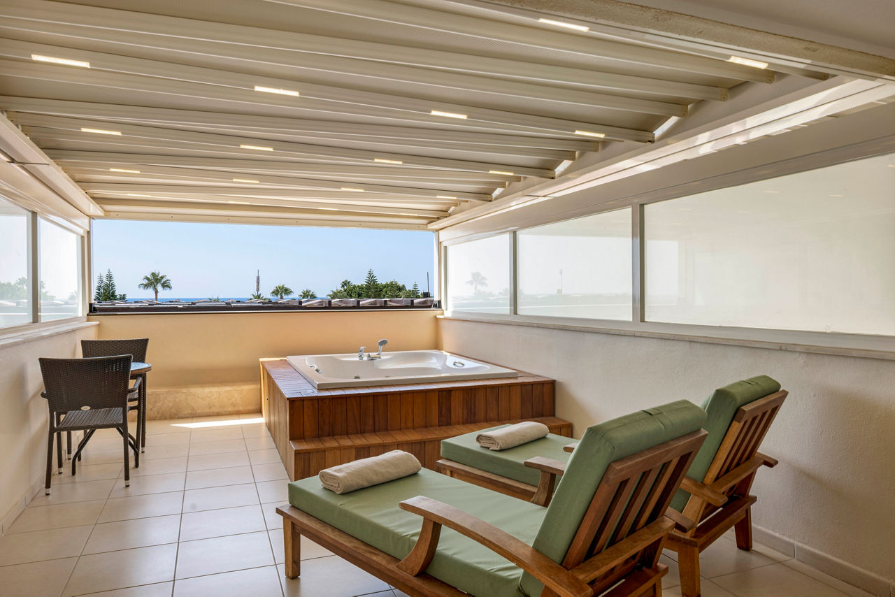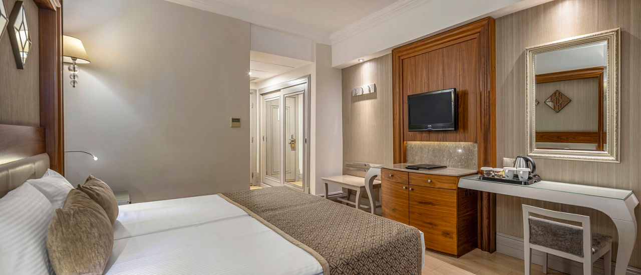 Standard Double or Twin rooms sleep up to 3 adults and have bathroom containing a shower, air conditioning, hairdryer, flat screen television, safety deposit box, coffee making facilities and balcony. Standard Double or Twin Economy rooms, Standard Double or Twin rooms with Sea View, Large Double or Twin rooms, Family rooms sleeping up to 4 adults, Family rooms with Sea View and Sole Use rooms are also available.
