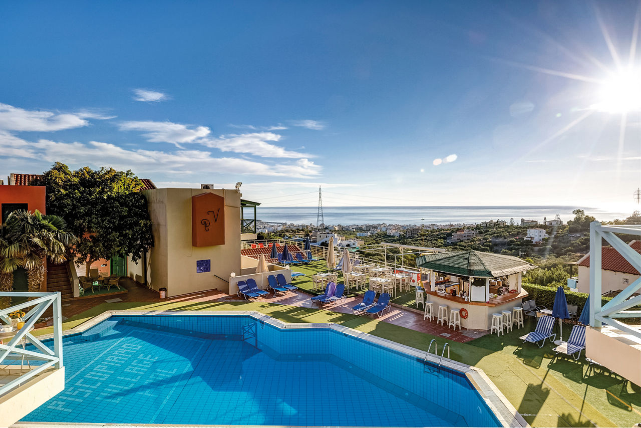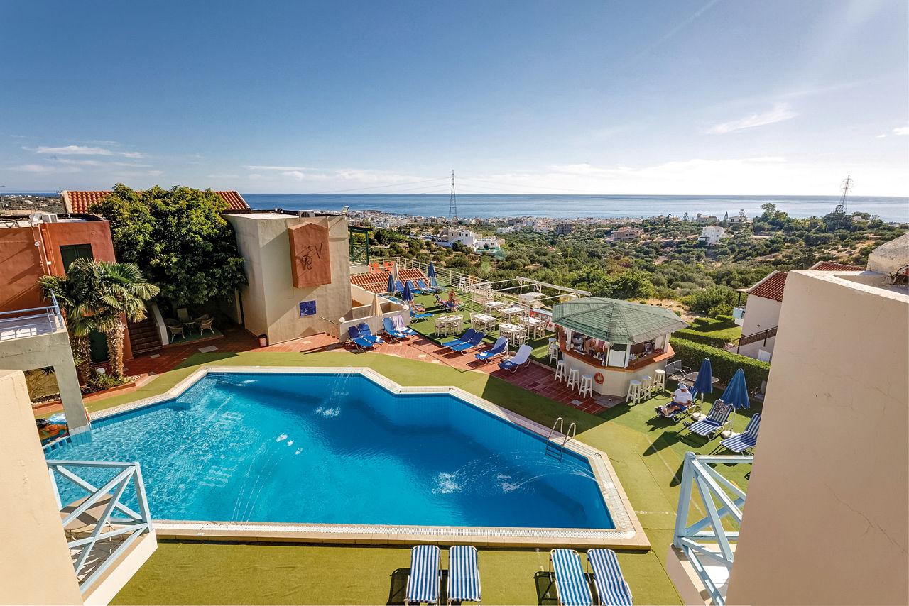 Designed to replicate a Cretan village, Piskopiano Village is perched on a hillside and offers sweeping panoramic views across the countryside to the resort of Hersonissos and the Mediterranean Sea. With traditional tavernas and shops nearby, these apartments are ideal for those wanting to sample an authentic slice of Greek life. It?s no wonder the Piskopiano Village is popular with repeat guests, thanks to the friendly and welcoming atmosphere and the great value for money accommodation.