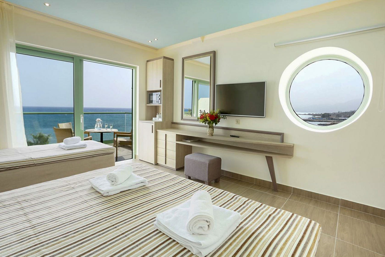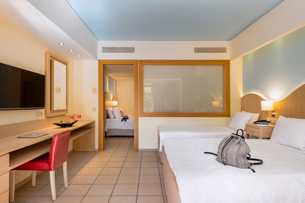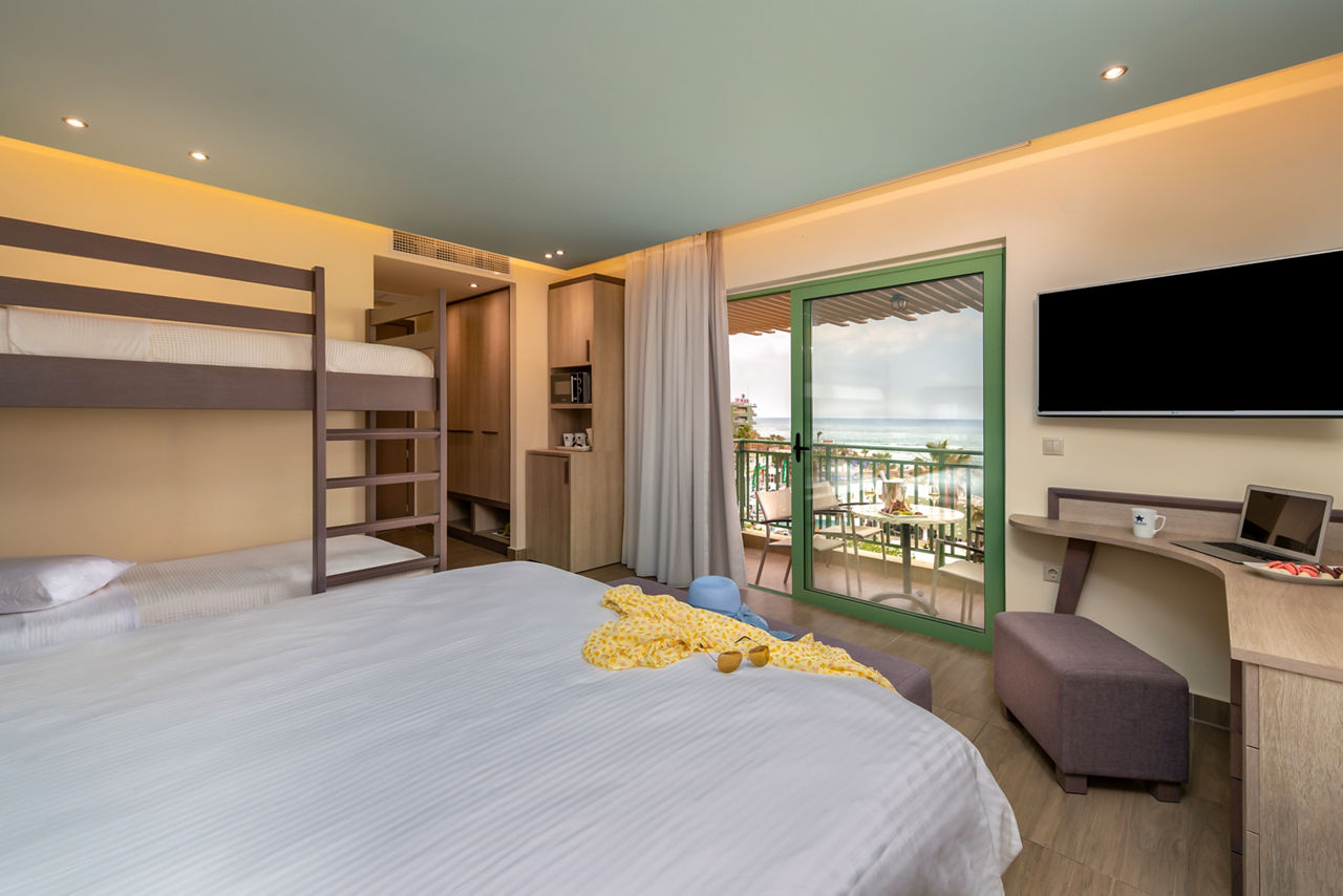 Open plan Studios sleep up to 3 adults or 2 adults and 2 children and have 3 beds and a sofa bed if needed, air-conditioning, kitchenette, bathroom with bath and shower, TV, hairdryer and balcony or terrace. Standard Family rooms sleeping up to 4 adults and 2 children have a separate bedroom and additional toilet and have 2 single beds, 1 double and 2 sofa beds. Superior family rooms sleeping up to 5 adults and 1 child and with 3 single beds, 1 double and 1 sofa bed are also available.
